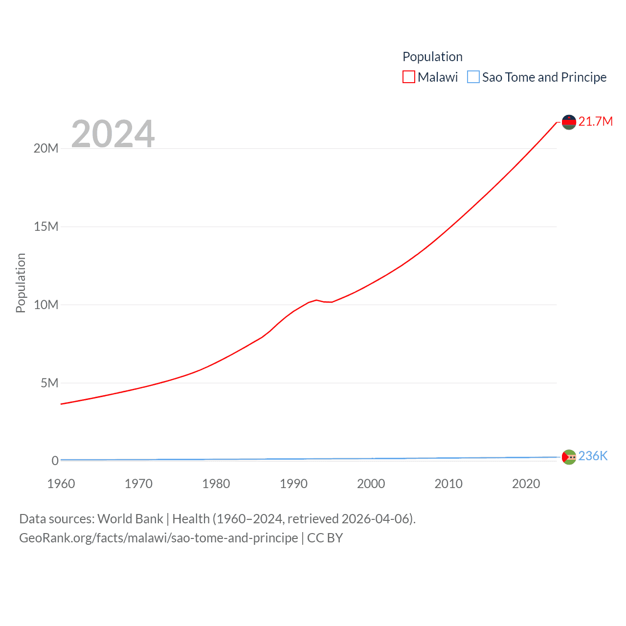Malawi has a population of 21.7M (ranked 62/197), compared with 236K in Sao Tome and Principe (ranked 176/197). Malawi's land area is 36,402 sq mi versus 371 sq mi for Sao Tome and Principe (ranked 107th vs. 172nd).