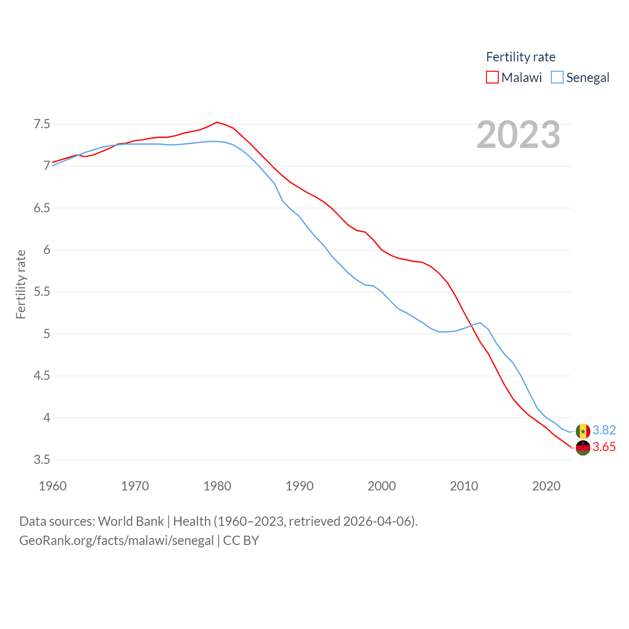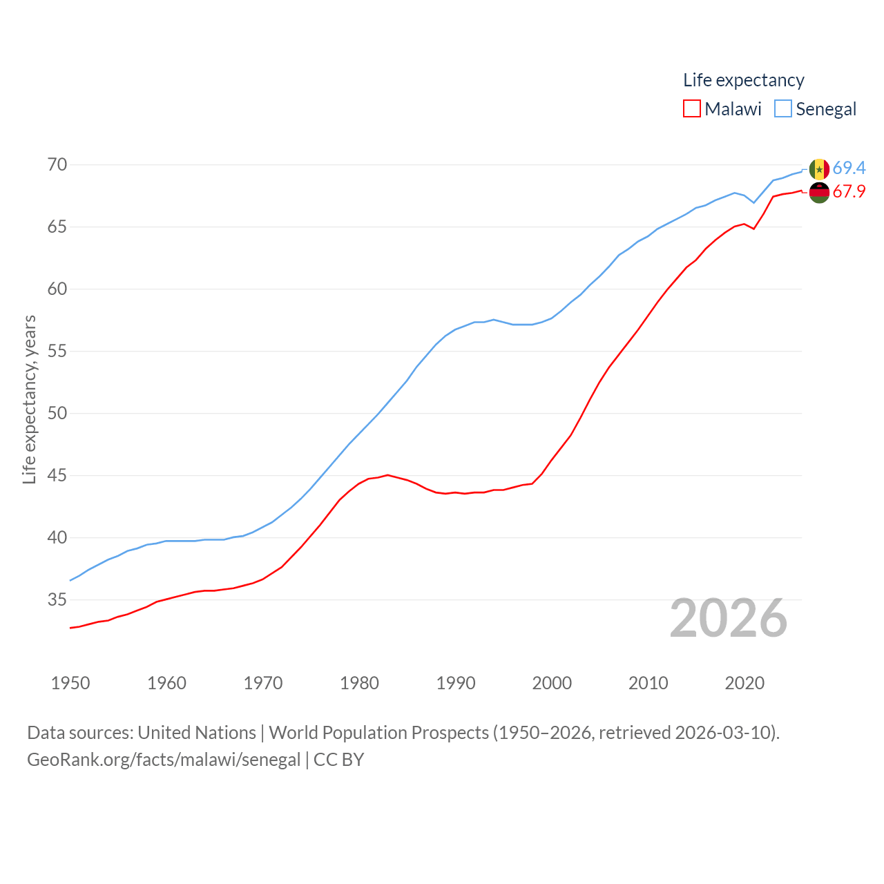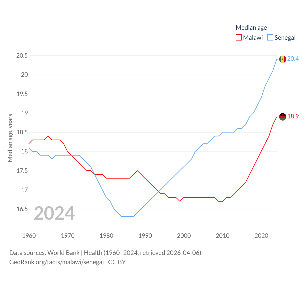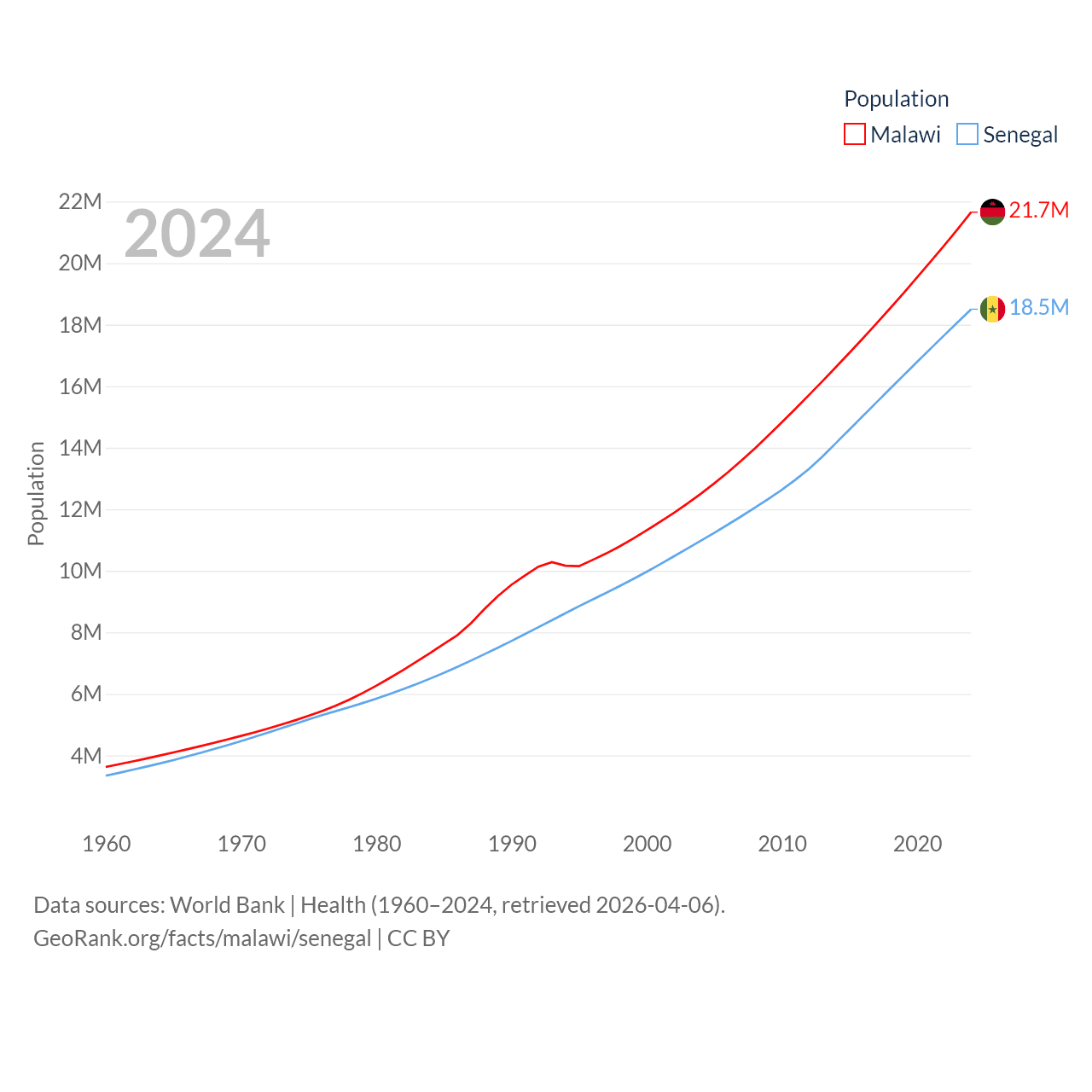 Malawi has a population of 21.7M (ranked 62/197), compared with 18.5M in Senegal (ranked 69/197). Malawi's land area is 36,402 sq mi versus 74,336 sq mi for Senegal (ranked 107th vs. 85th).