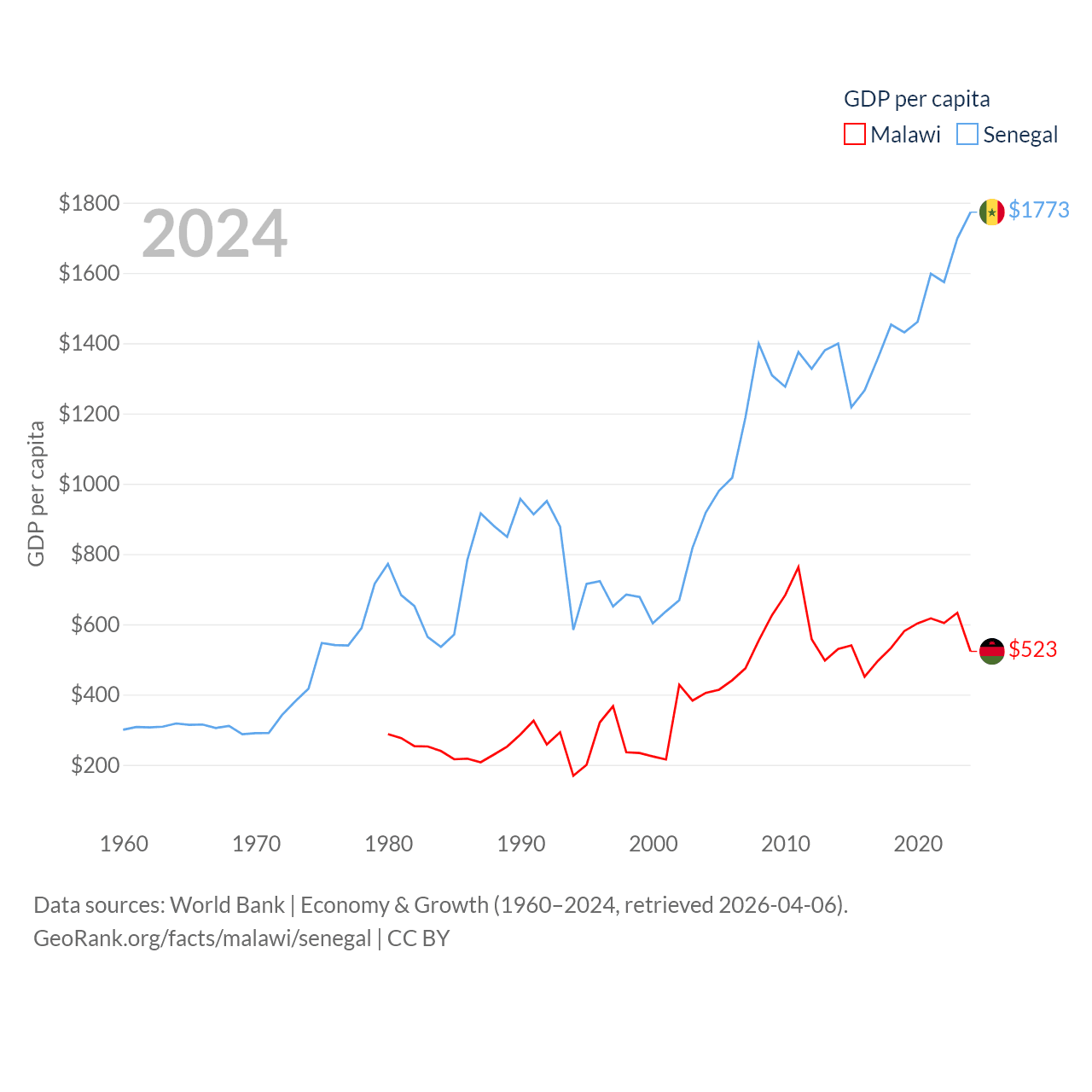 By GDP, Malawi ranks 151/197 ($11.3B) and Senegal ranks 109/197 ($32.8B). By GDP per capita, Malawi ranks 194/197 ($523), while Senegal ranks 159/197 ($1,773).