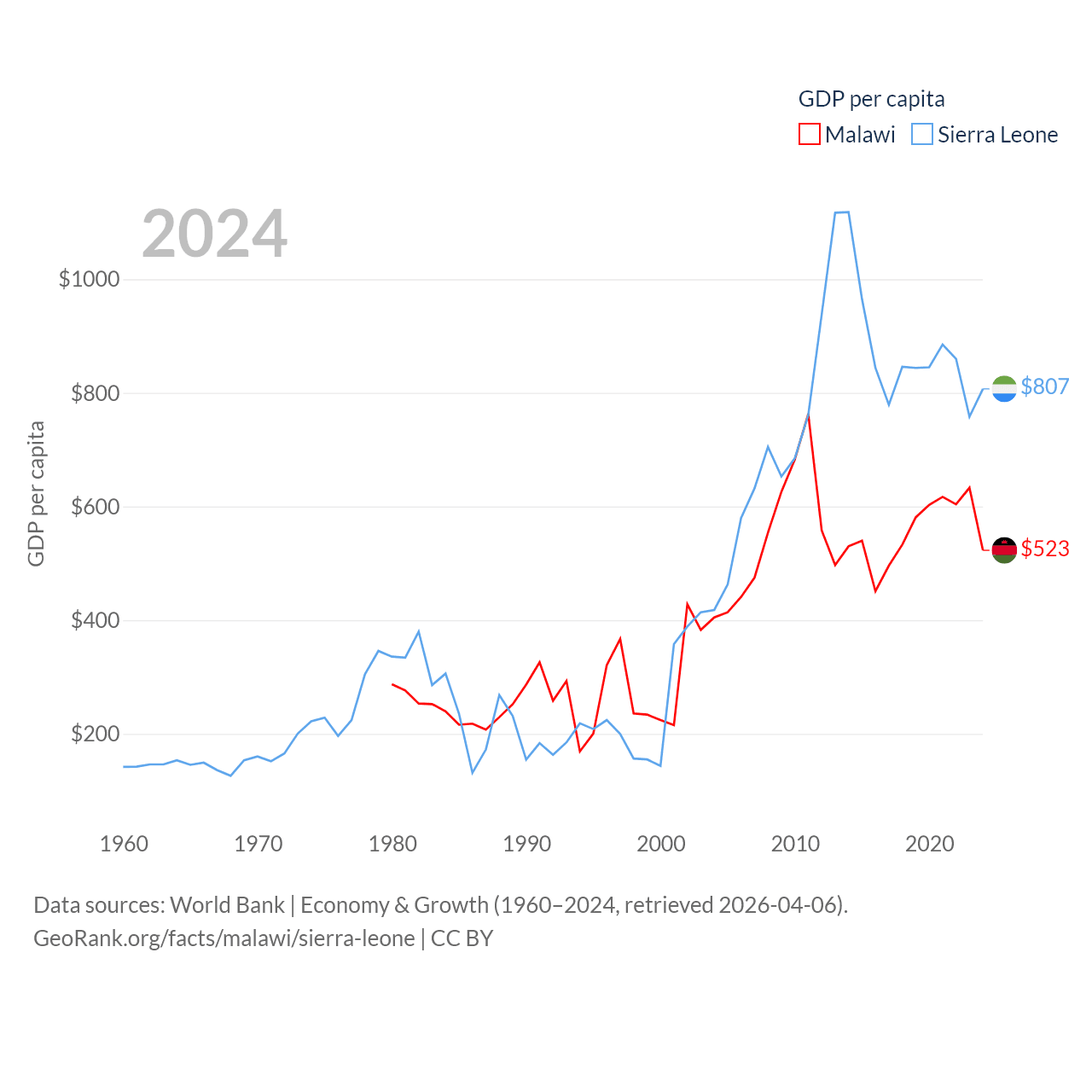 By GDP, Malawi ranks 151/197 ($11.3B) and Sierra Leone ranks 160/197 ($6.97B). By GDP per capita, Malawi ranks 194/197 ($523), while Sierra Leone ranks 186/197 ($807).