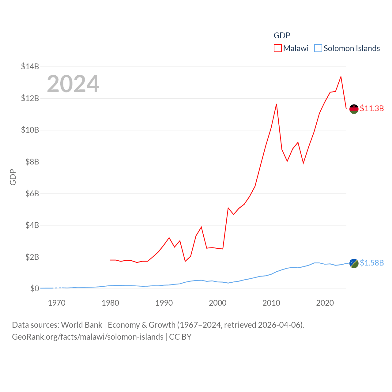By GDP, Malawi ranks 151/197 ($11.3B) and The Solomon Islands ranks 182/197 ($1.58B). By GDP per capita, Malawi ranks 194/197 ($523), while The Solomon Islands ranks 157/197 ($1,934).