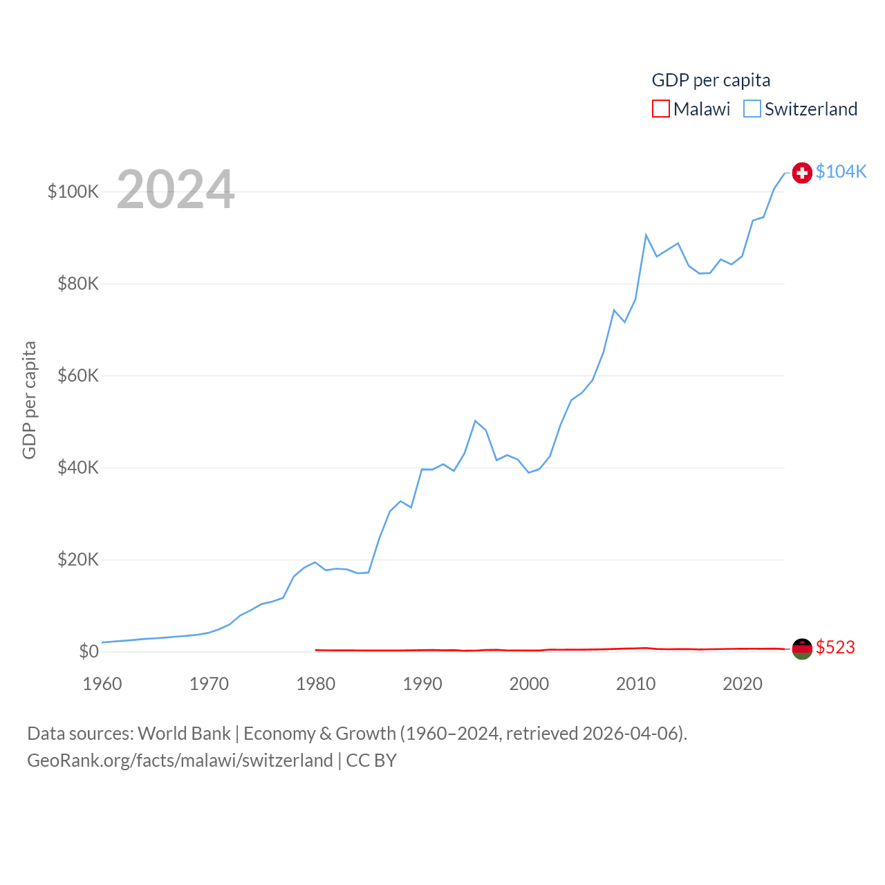 By GDP, Malawi ranks 151/197 ($11.3B) and Switzerland ranks 20/197 ($937B). By GDP per capita, Malawi ranks 194/197 ($523), while Switzerland ranks 5/197 ($103,998).