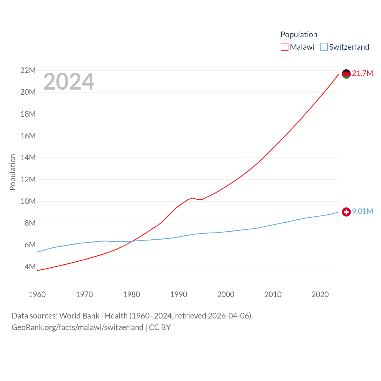Malawi has a population of 21.7M (ranked 62/197), compared with 9.01M in Switzerland (ranked 101/197). Malawi's land area is 36,402 sq mi versus 15,255 sq mi for Switzerland (ranked 107th vs. 131st).