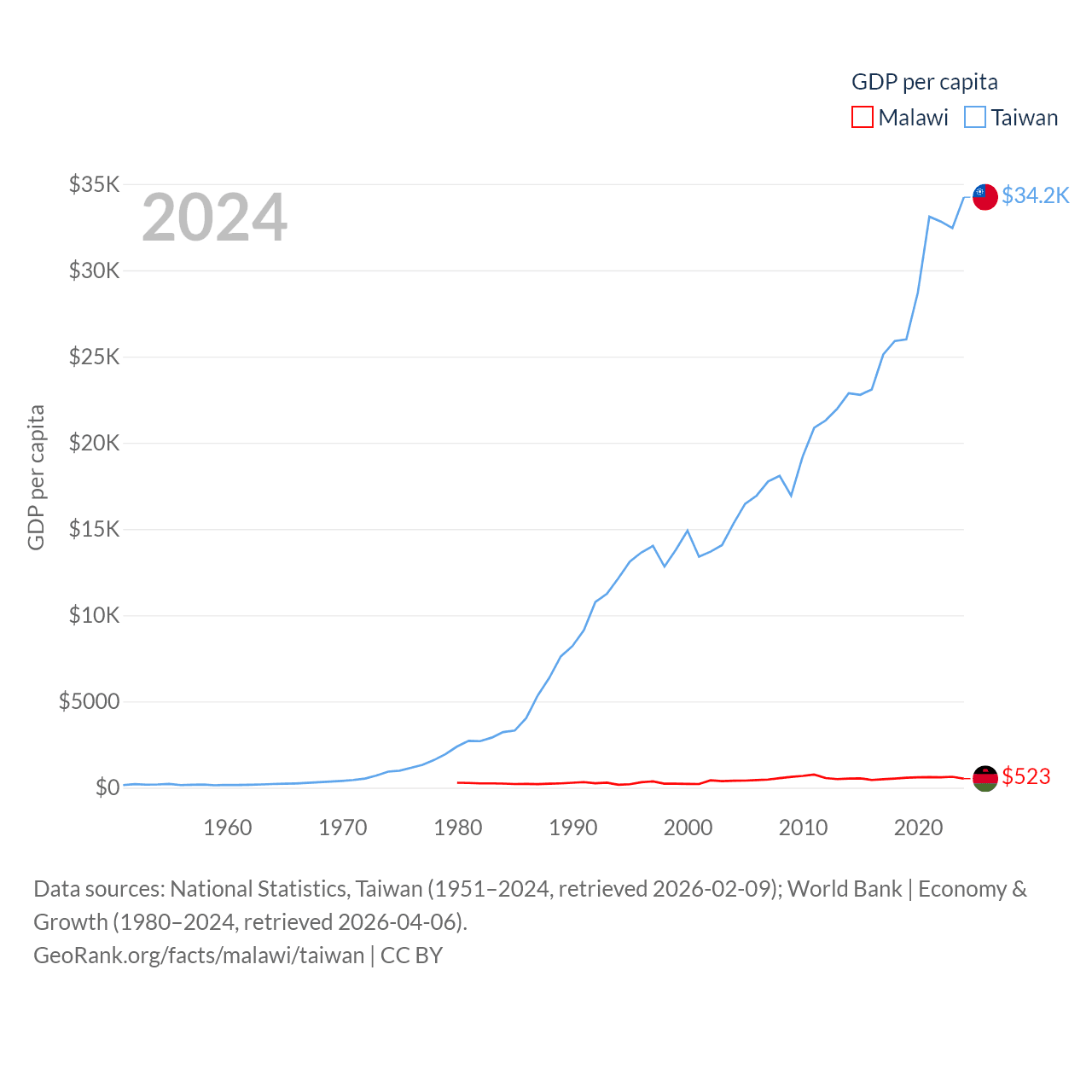 By GDP, Malawi ranks 151/197 ($11.3B) and Taiwan ranks 22/197 ($802B). By GDP per capita, Malawi ranks 194/197 ($523), while Taiwan ranks 35/197 ($34,238).