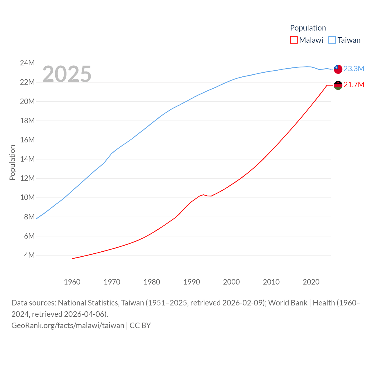 Malawi has a population of 21.7M (ranked 62/197), compared with 23.3M in Taiwan (ranked 60/197). Malawi's land area is 36,402 sq mi versus 13,976 sq mi for Taiwan (ranked 107th vs. 133rd).