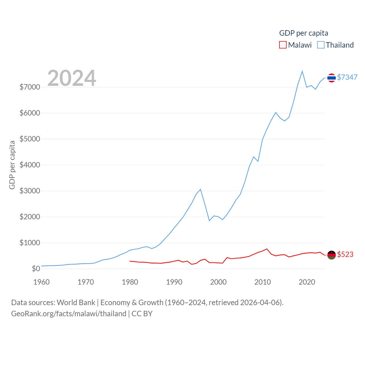 By GDP, Malawi ranks 151/197 ($11.3B) and Thailand ranks 31/197 ($527B). By GDP per capita, Malawi ranks 194/197 ($523), while Thailand ranks 100/197 ($7,347).