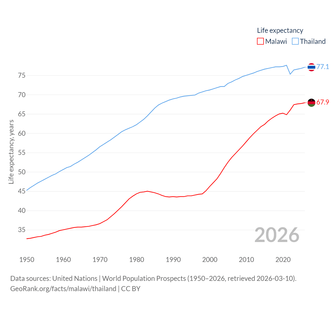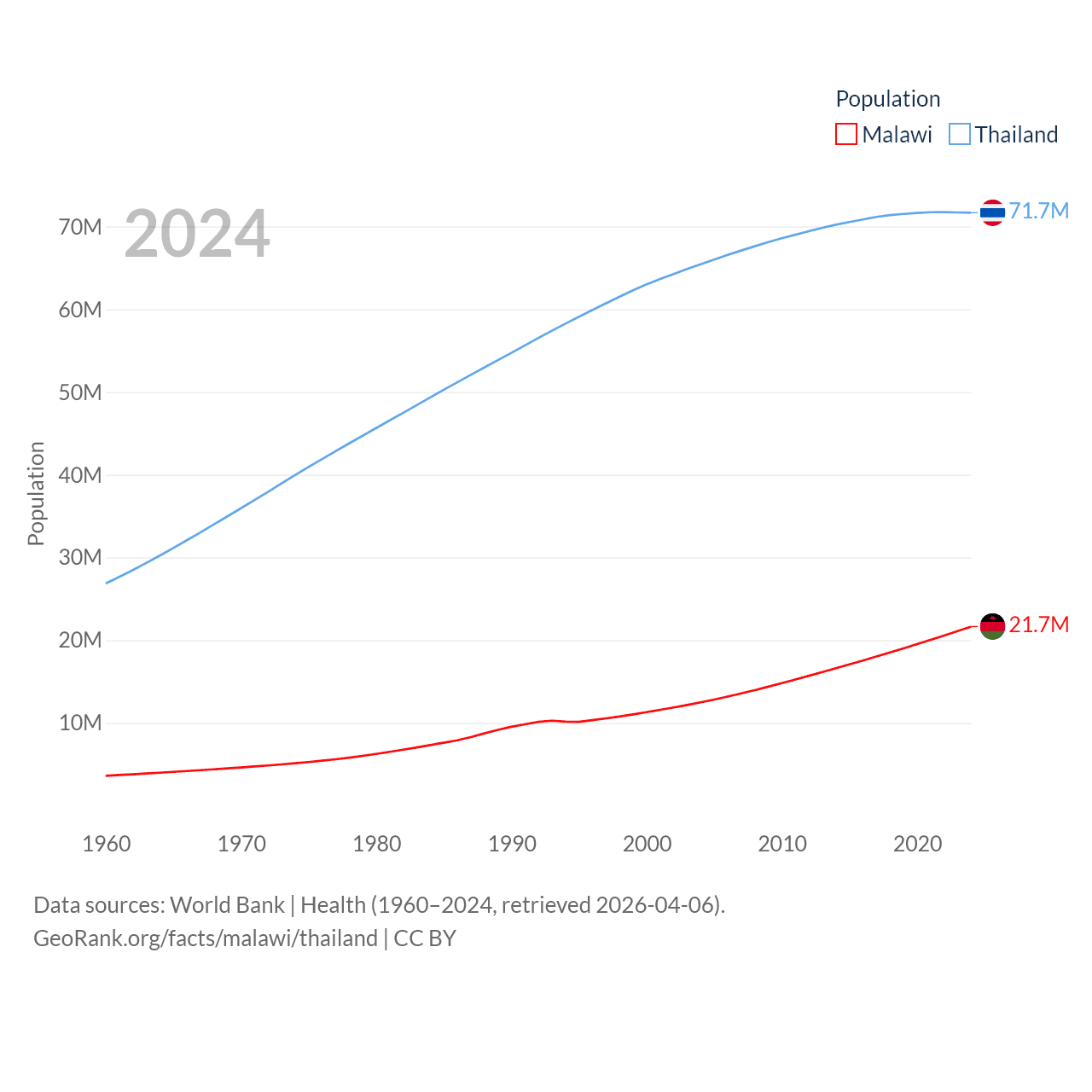 Malawi has a population of 21.7M (ranked 62/197), compared with 71.7M in Thailand (ranked 20/197). Malawi's land area is 36,402 sq mi versus 197,256 sq mi for Thailand (ranked 107th vs. 50th).