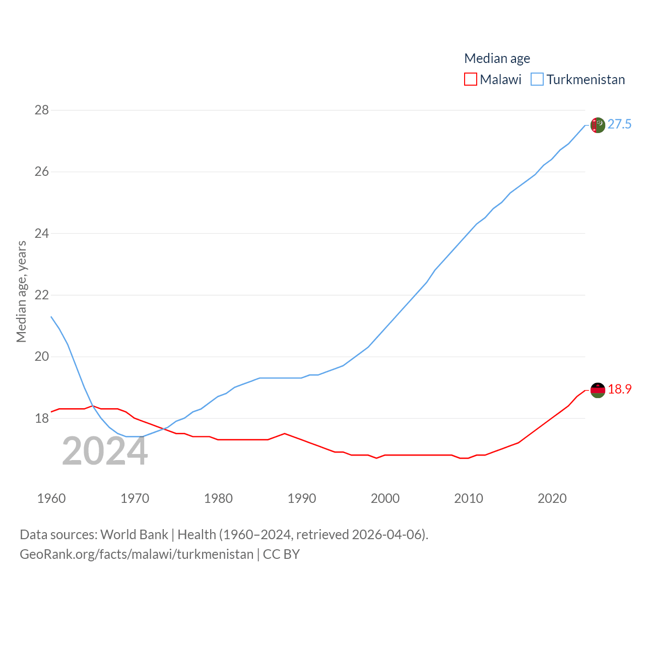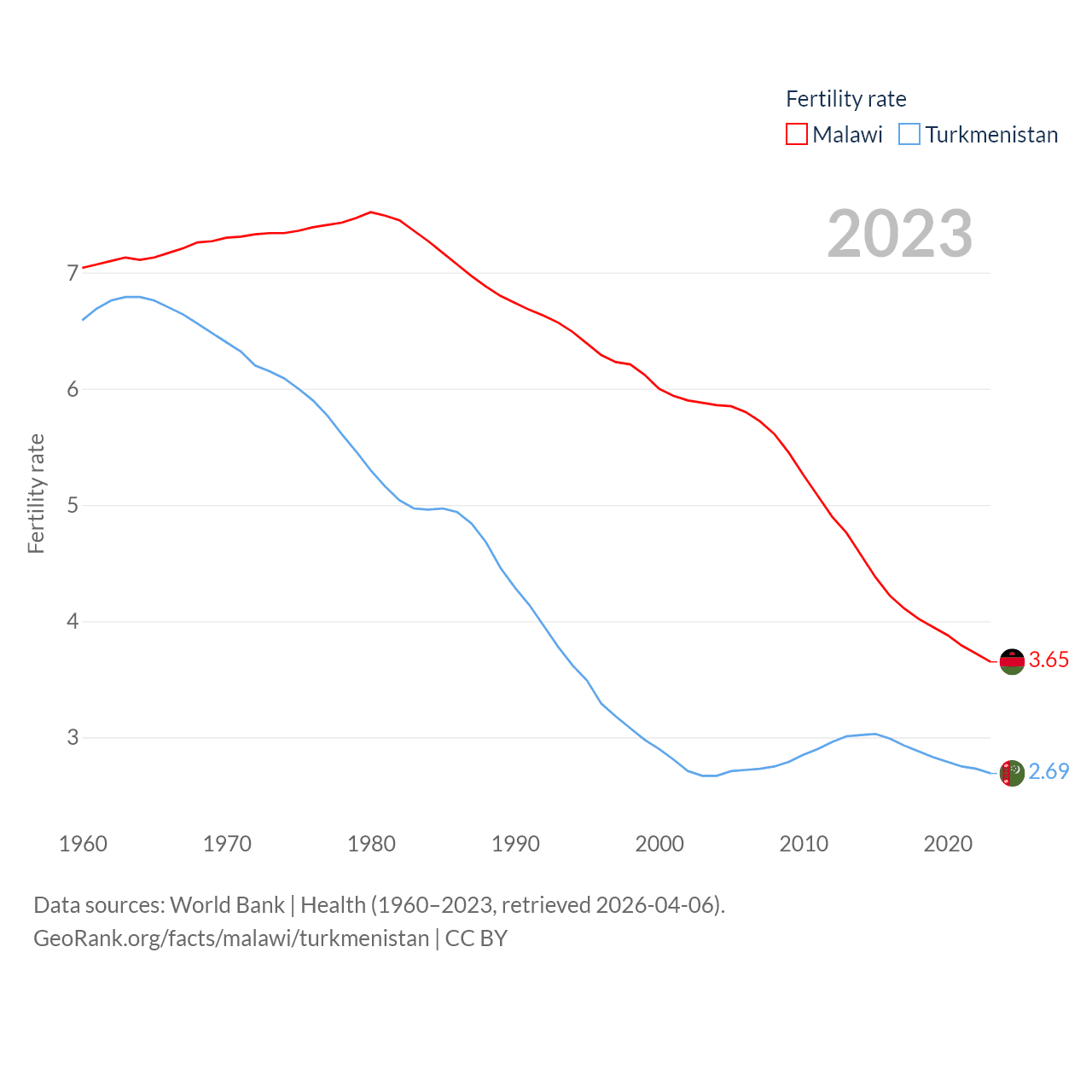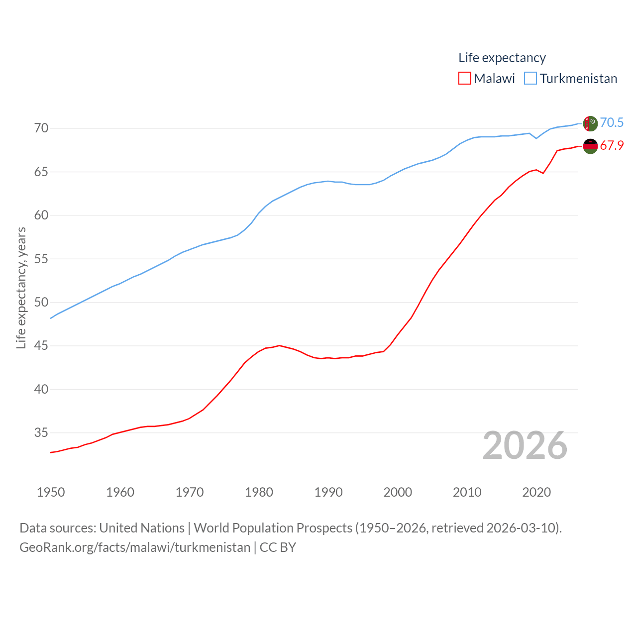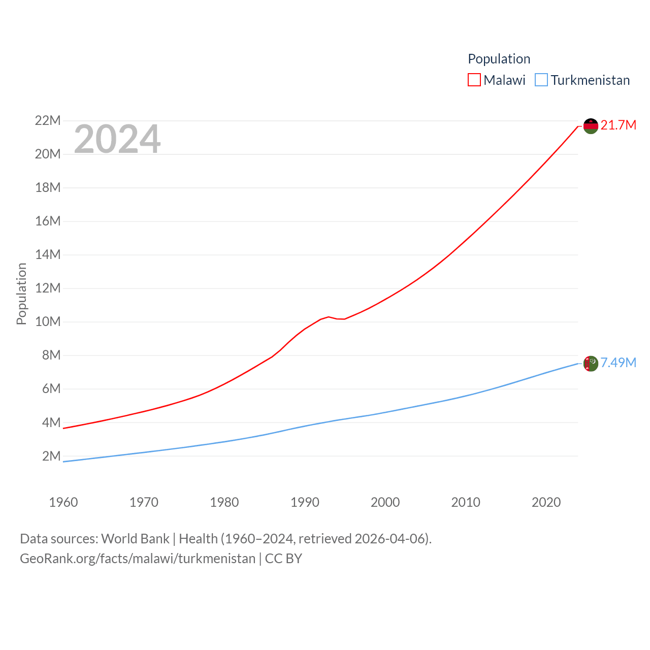 Malawi has a population of 21.7M (ranked 62/197), compared with 7.49M in Turkmenistan (ranked 104/197). Malawi's land area is 36,402 sq mi versus 181,441 sq mi for Turkmenistan (ranked 107th vs. 53rd).