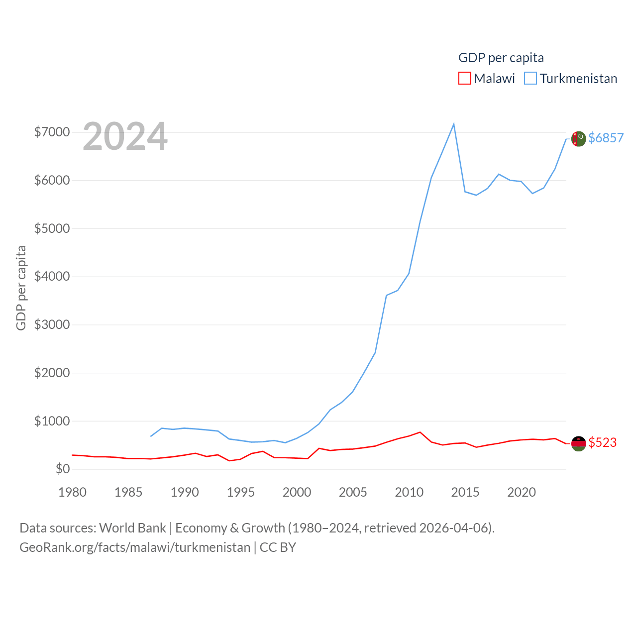 By GDP, Malawi ranks 151/197 ($11.3B) and Turkmenistan ranks 92/197 ($51.4B). By GDP per capita, Malawi ranks 194/197 ($523), while Turkmenistan ranks 104/197 ($6,857).