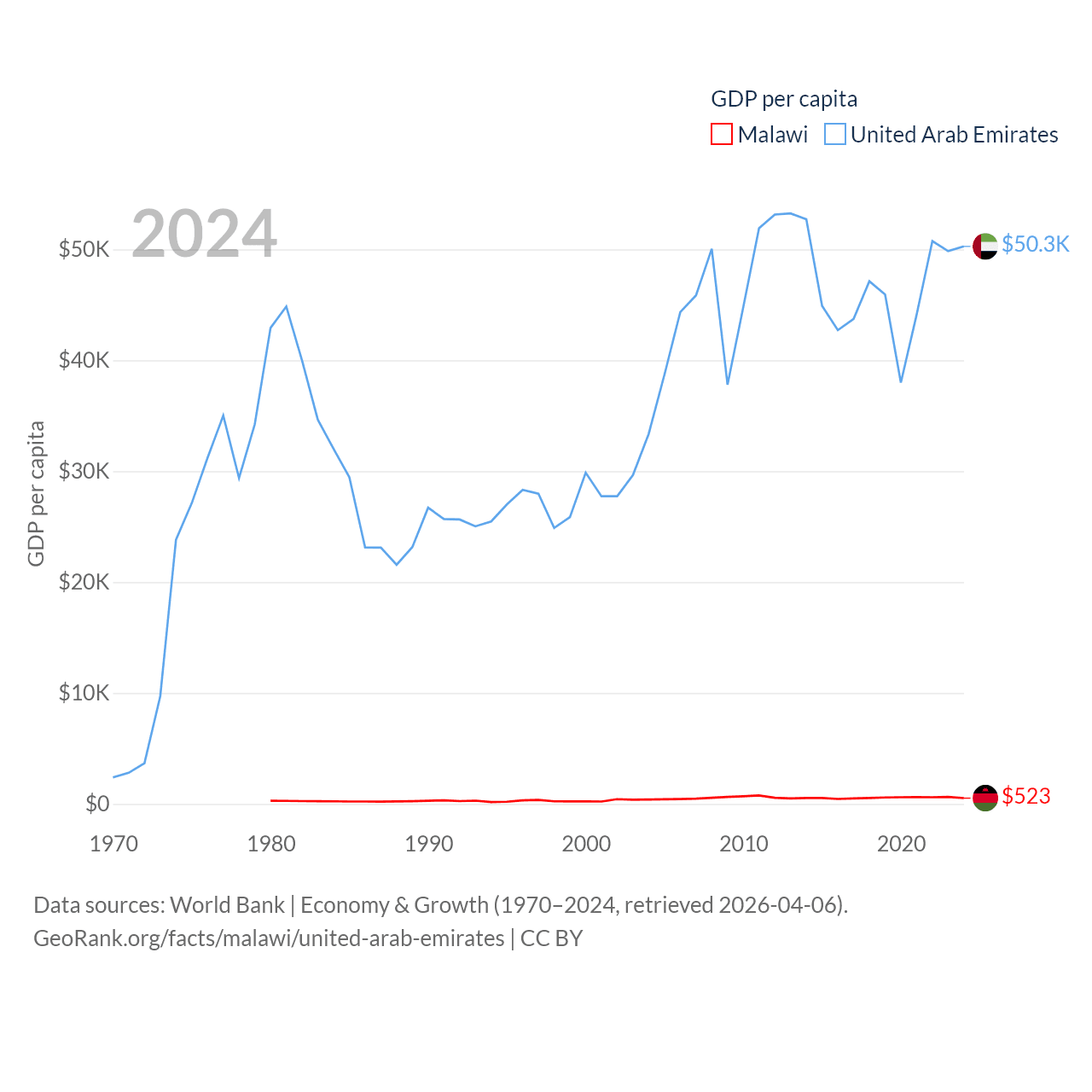 By GDP, Malawi ranks 151/197 ($11.3B) and The United Arab Emirates ranks 27/197 ($552B). By GDP per capita, Malawi ranks 194/197 ($523), while The United Arab Emirates ranks 24/197 ($50,274).