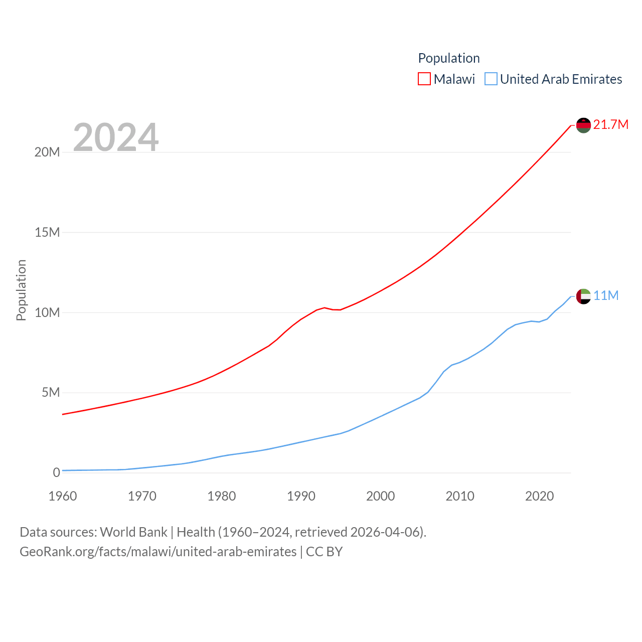 Malawi has a population of 21.7M (ranked 62/197), compared with 11M in The United Arab Emirates (ranked 86/197). Malawi's land area is 36,402 sq mi versus 27,421 sq mi for The United Arab Emirates (ranked 107th vs. 117th).