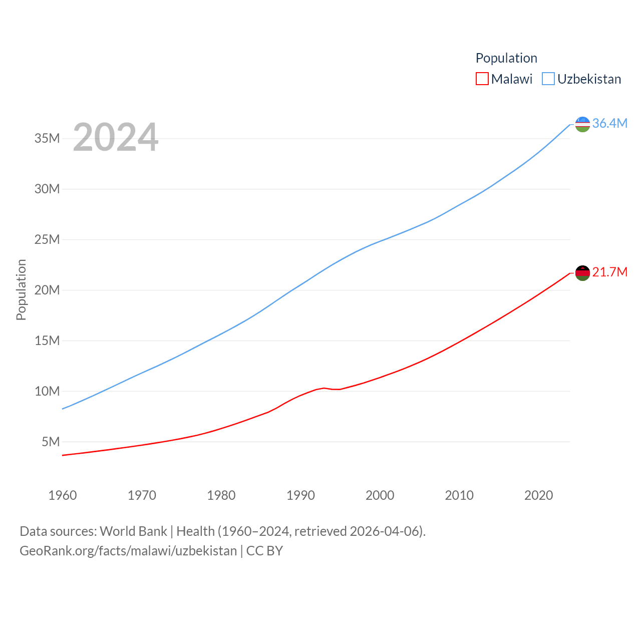 Malawi has a population of 21.7M (ranked 62/197), compared with 36.4M in Uzbekistan (ranked 43/197). Malawi's land area is 36,402 sq mi versus 170,136 sq mi for Uzbekistan (ranked 107th vs. 56th).