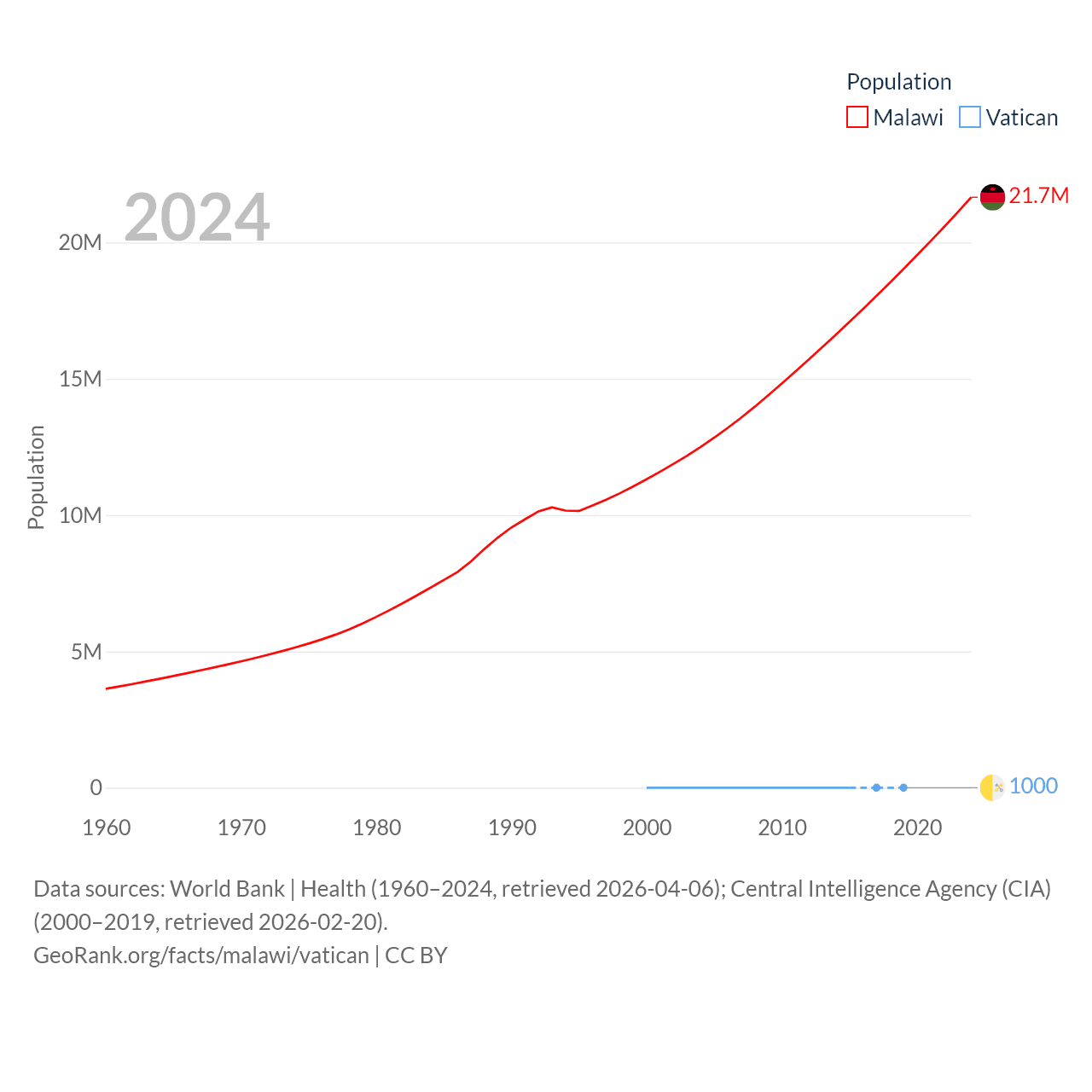 Malawi has a population of 21.7M (ranked 62/197), compared with 1K in The Vatican (ranked 197/197). Malawi's land area is 36,402 sq mi versus 0.17 sq mi for The Vatican (ranked 107th vs. 197th).