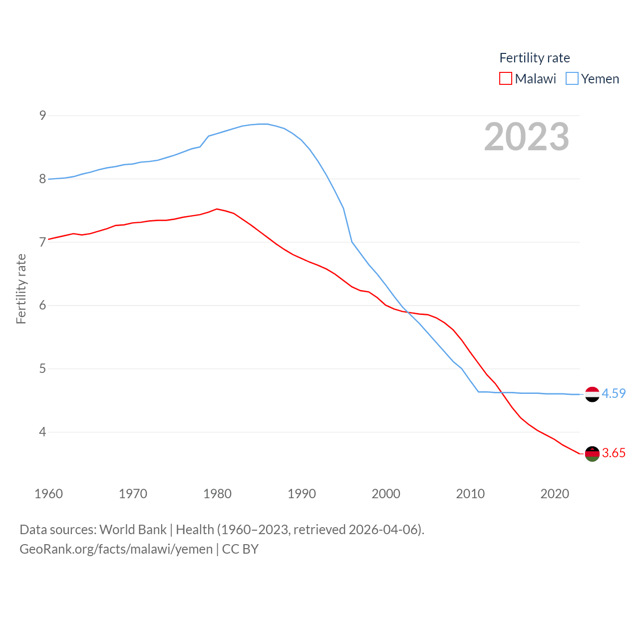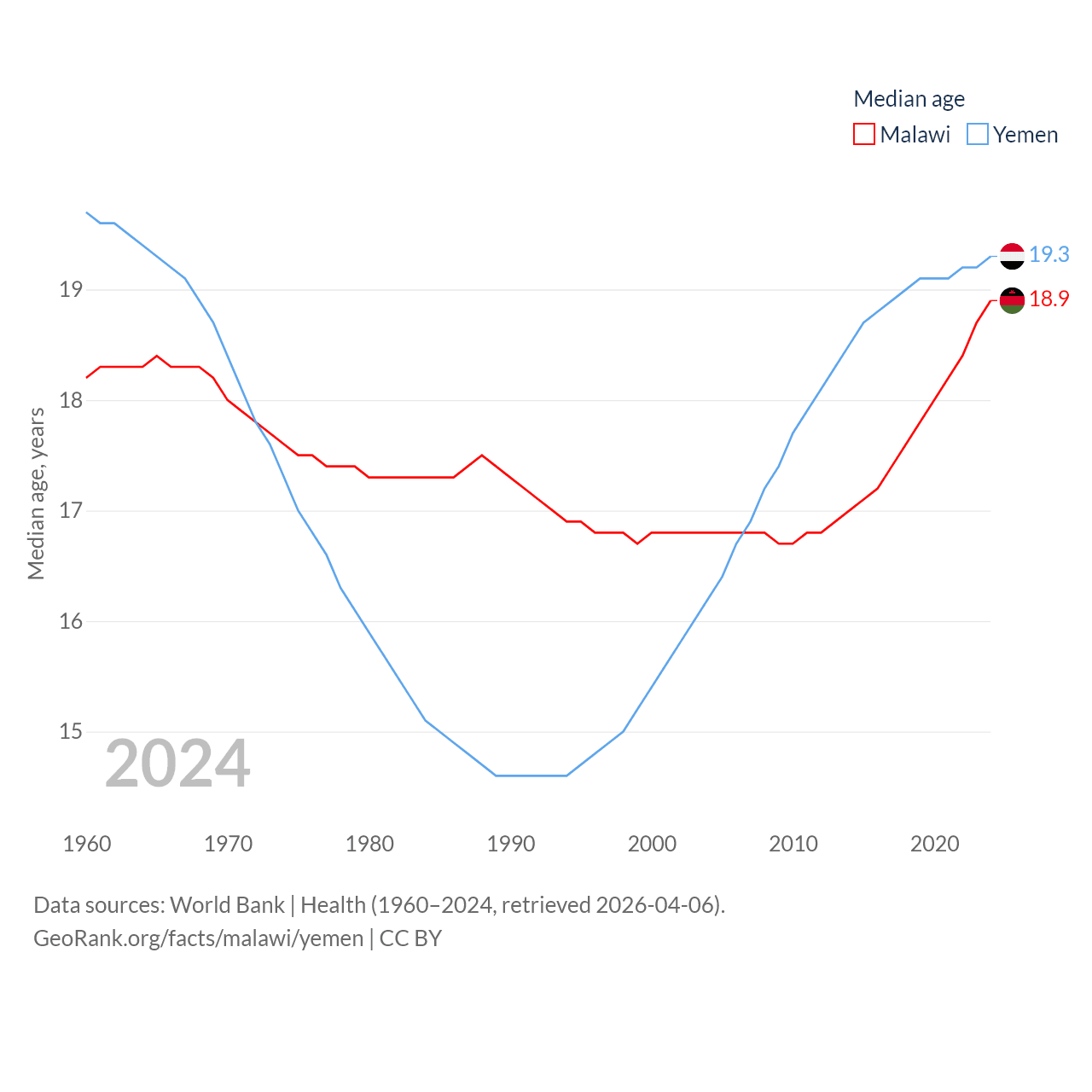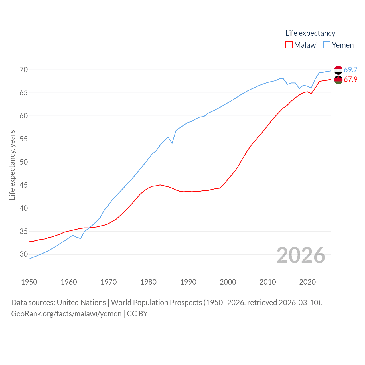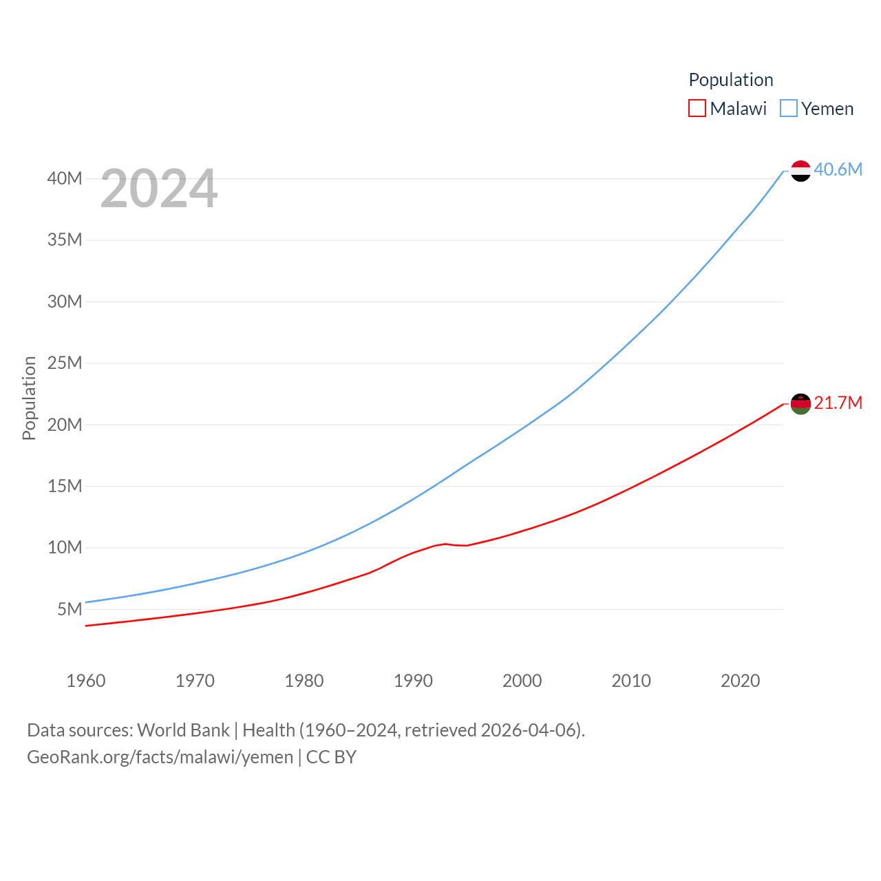 Malawi has a population of 21.7M (ranked 62/197), compared with 40.6M in Yemen (ranked 38/197). Malawi's land area is 36,402 sq mi versus 203,850 sq mi for Yemen (ranked 107th vs. 49th).