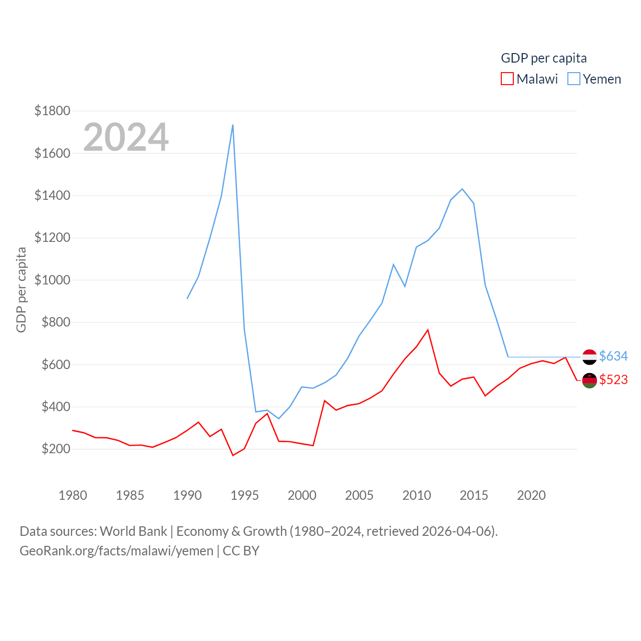 By GDP, Malawi ranks 151/197 ($11.3B) and Yemen ranks 125/197 ($21.6B). By GDP per capita, Malawi ranks 194/197 ($523), while Yemen ranks 191/197 ($634).