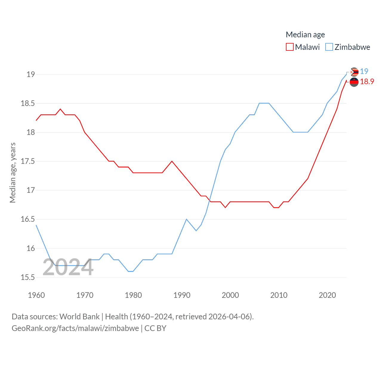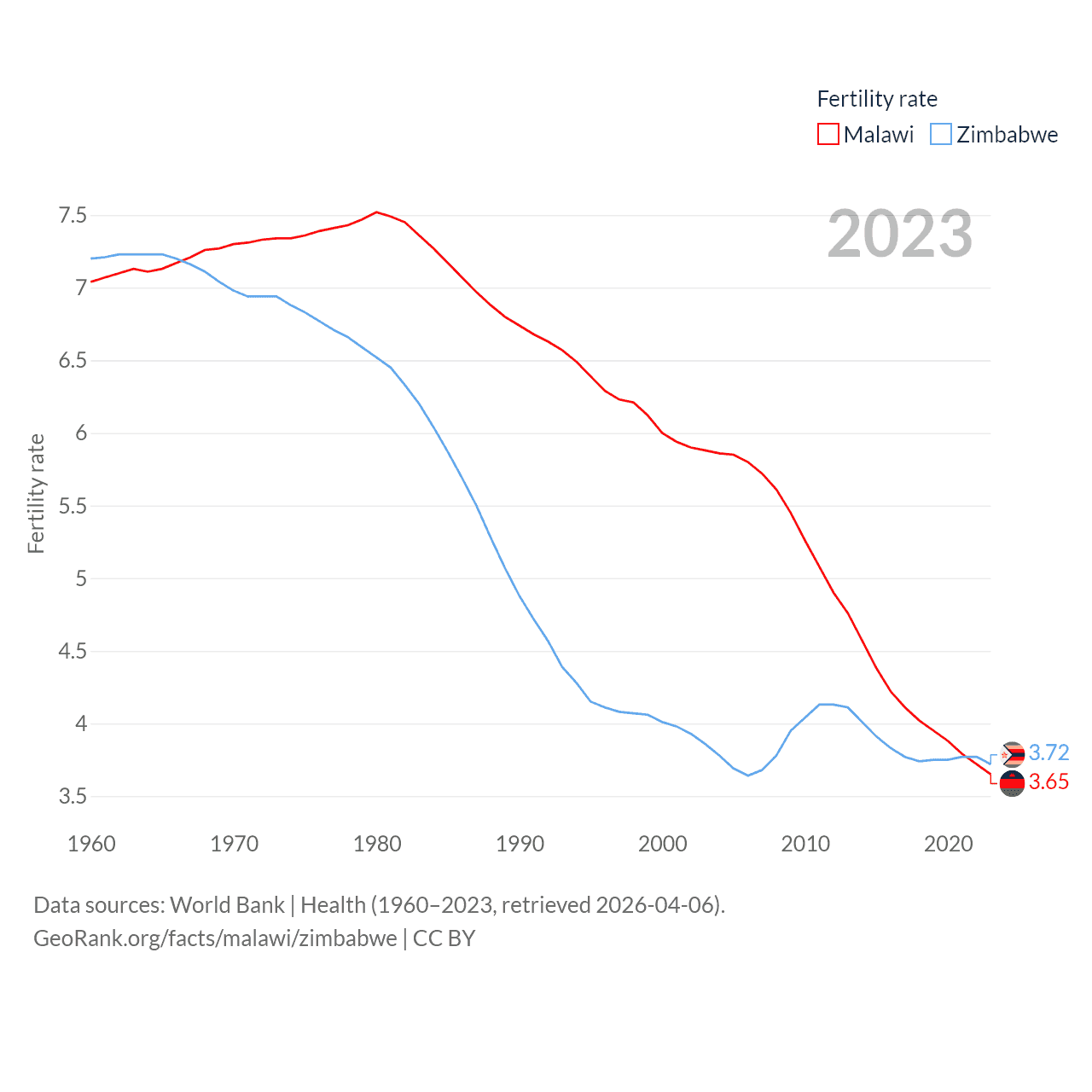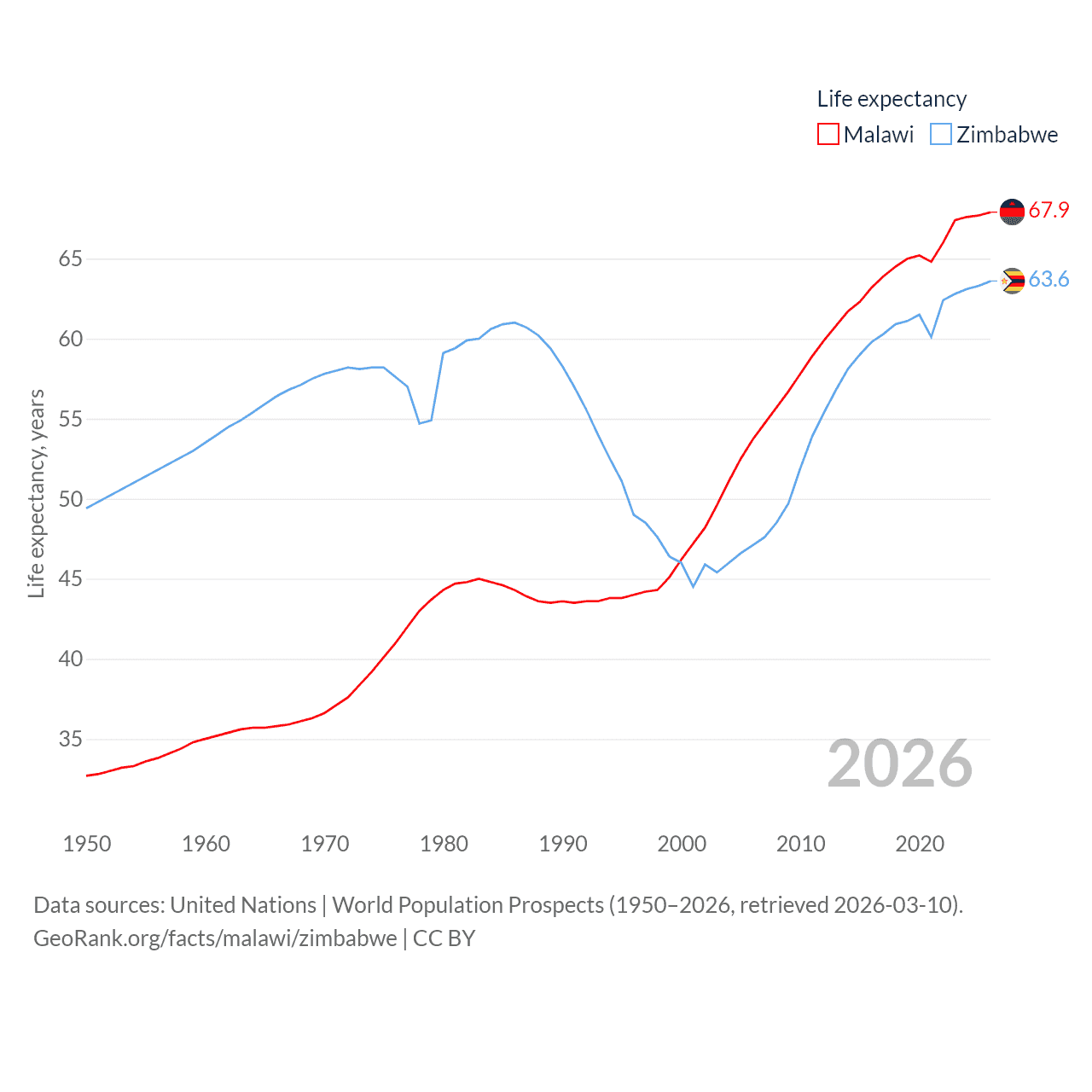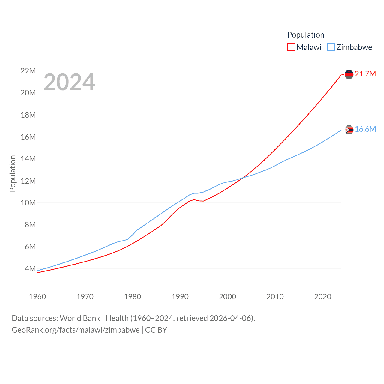 Malawi has a population of 21.7M (ranked 62/197), compared with 16.6M in Zimbabwe (ranked 74/197). Malawi's land area is 36,402 sq mi versus 149,364 sq mi for Zimbabwe (ranked 107th vs. 60th).