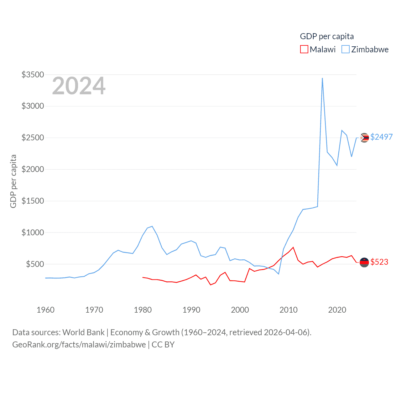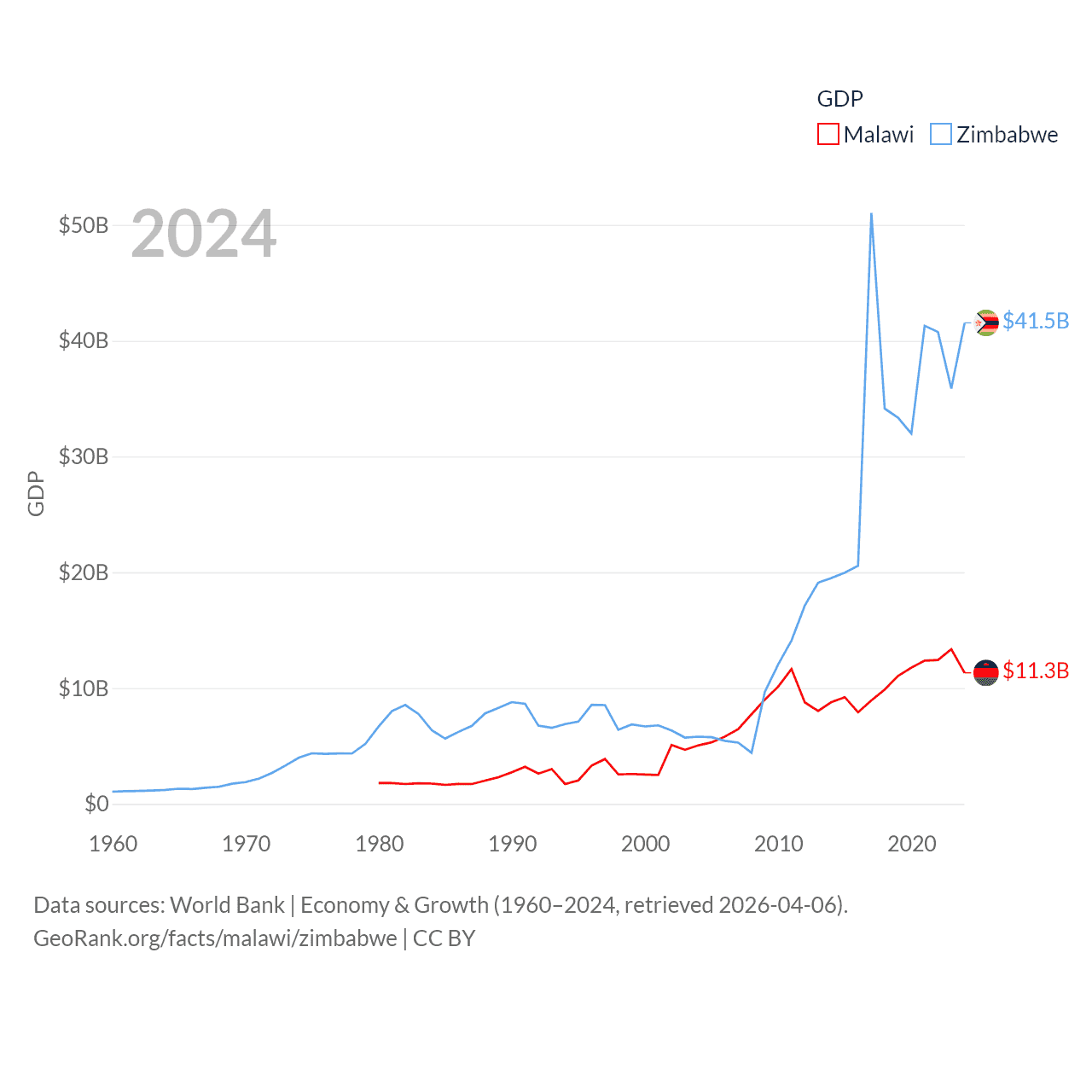 By GDP, Malawi ranks 151/197 ($11.3B) and Zimbabwe ranks 102/197 ($41.5B). By GDP per capita, Malawi ranks 194/197 ($523), while Zimbabwe ranks 148/197 ($2,497).
