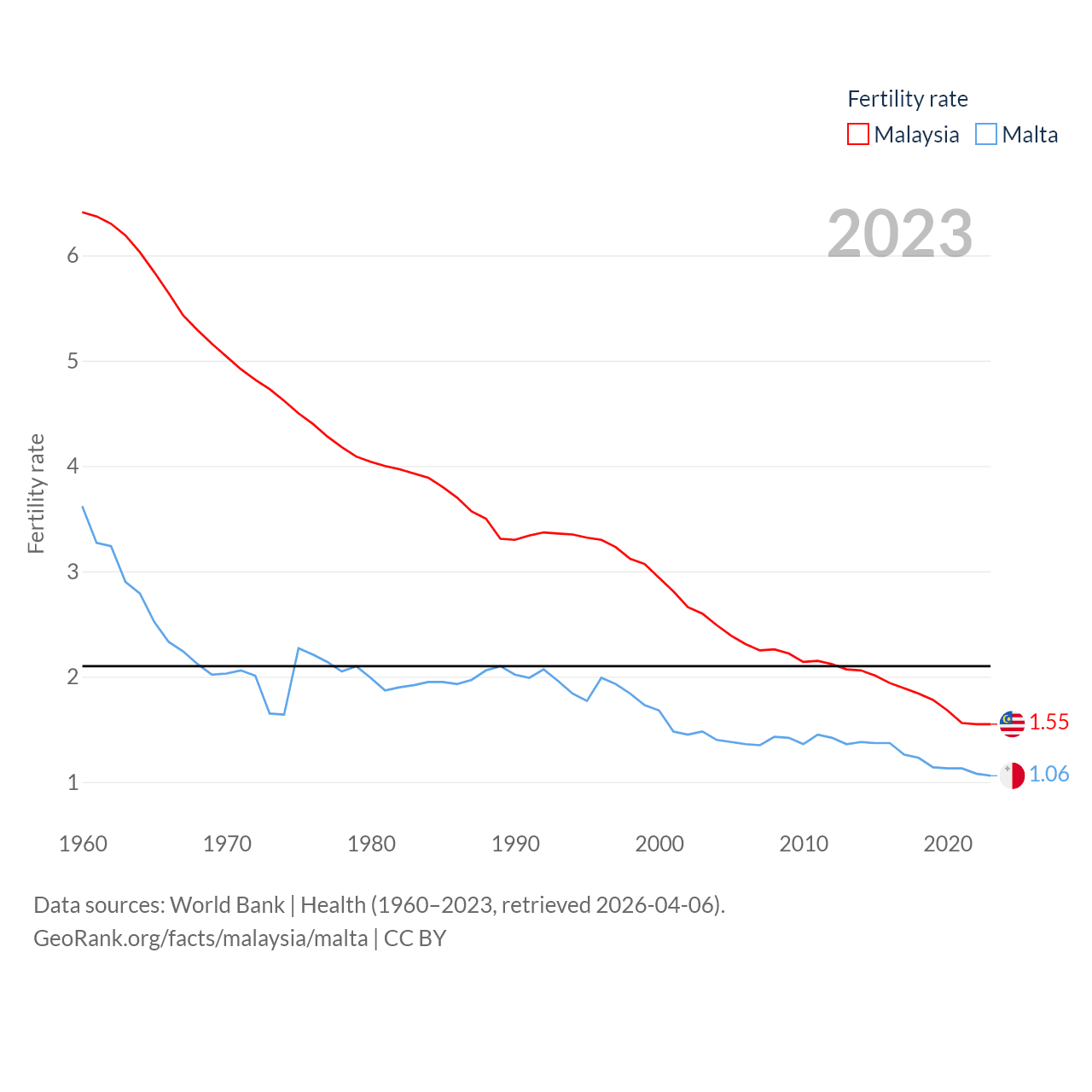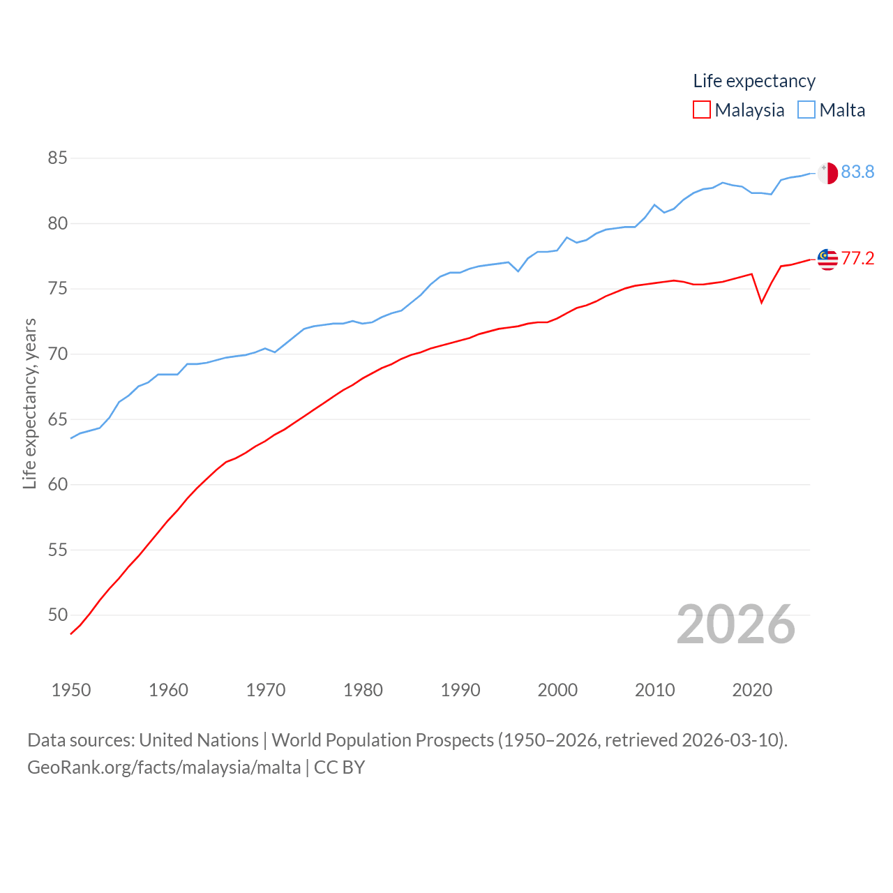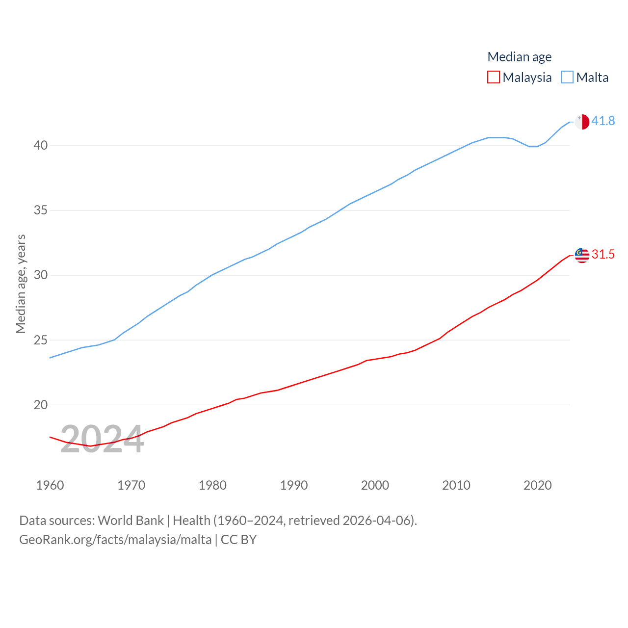 Malaysia has a population of 35.6M (ranked 44/197), compared with 569K in Malta (ranked 167/197). Malaysia's land area is 126,854 sq mi versus 123.6 sq mi for Malta (ranked 65th vs. 187th).