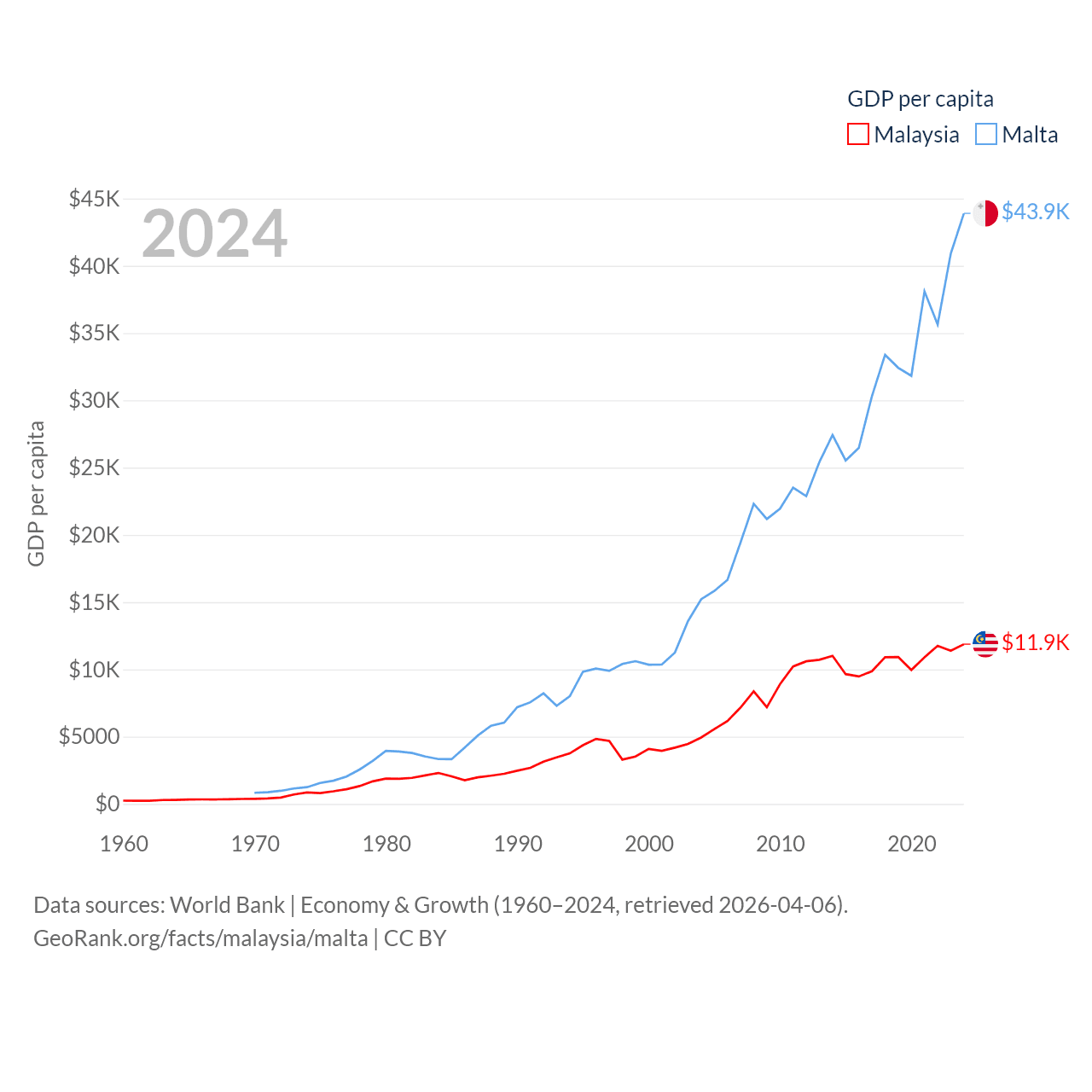 By GDP, Malaysia ranks 38/197 ($422B) and Malta ranks 119/197 ($25B). By GDP per capita, Malaysia ranks 79/197 ($11,874), while Malta ranks 28/197 ($43,899).