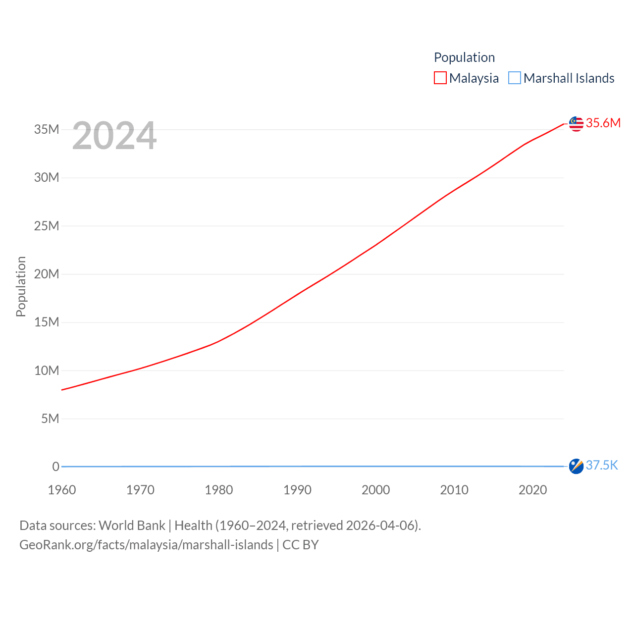 Malaysia has a population of 35.6M (ranked 44/197), compared with 37.5K in The Marshall Islands (ranked 192/197). Malaysia's land area is 126,854 sq mi versus 69.5 sq mi for The Marshall Islands (ranked 65th vs. 191st).
