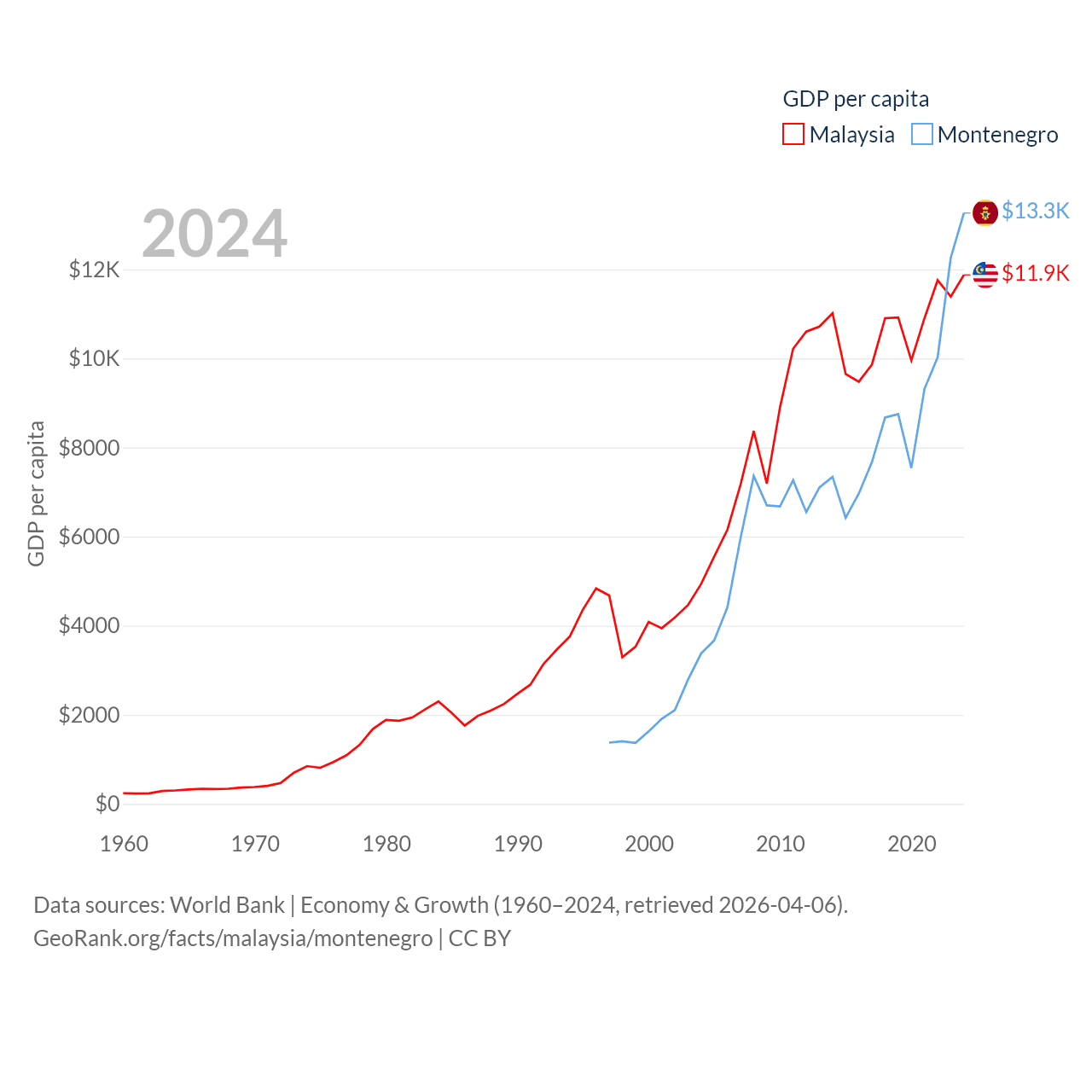 By GDP, Malaysia ranks 38/197 ($422B) and Montenegro ranks 155/197 ($8.27B). By GDP per capita, Malaysia ranks 79/197 ($11,874), while Montenegro ranks 77/197 ($13,263).