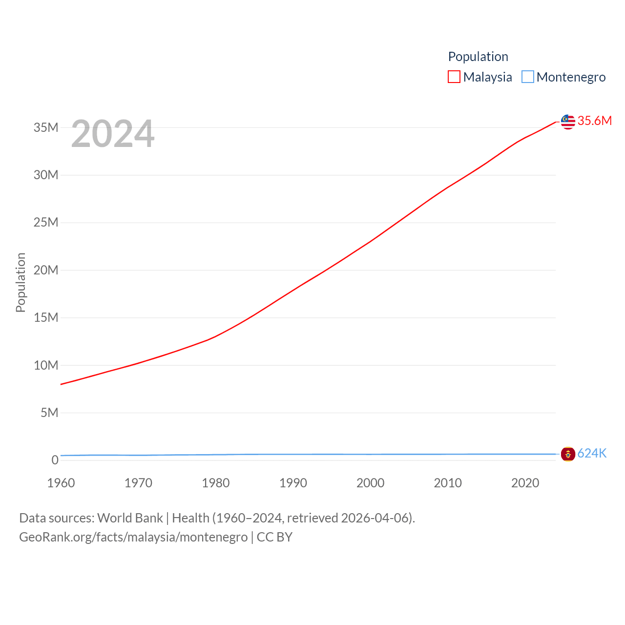 Malaysia has a population of 35.6M (ranked 44/197), compared with 624K in Montenegro (ranked 166/197). Malaysia's land area is 126,854 sq mi versus 5,193 sq mi for Montenegro (ranked 65th vs. 156th).