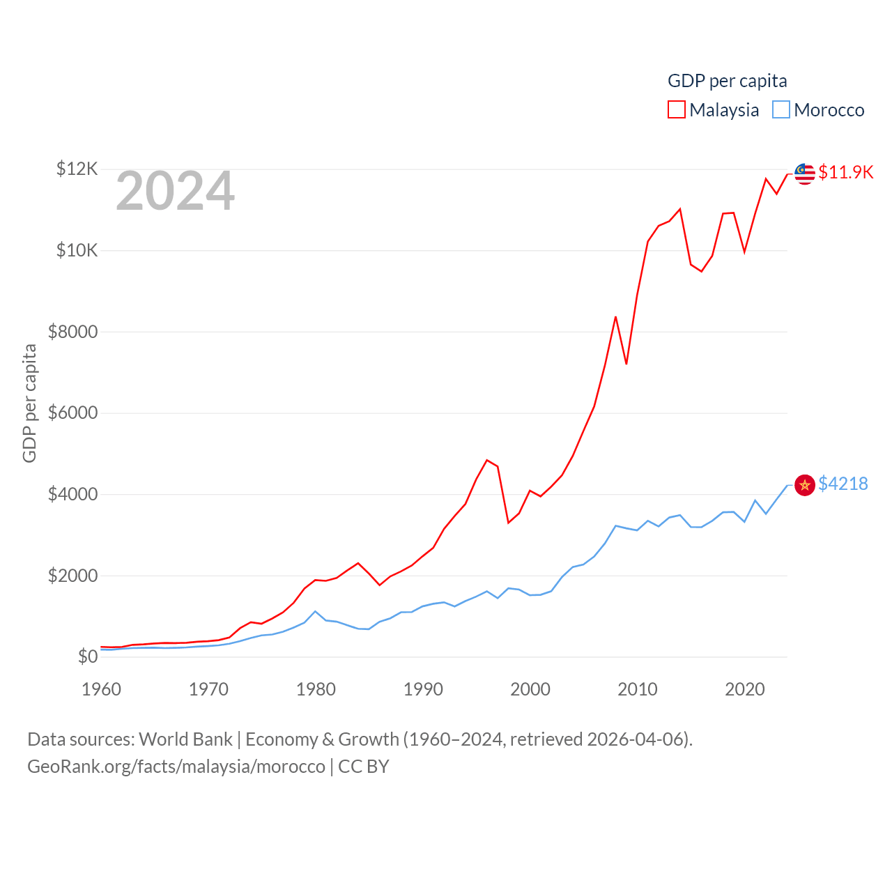 By GDP, Malaysia ranks 38/197 ($422B) and Morocco ranks 58/197 ($161B). By GDP per capita, Malaysia ranks 79/197 ($11,874), while Morocco ranks 127/197 ($4,218).