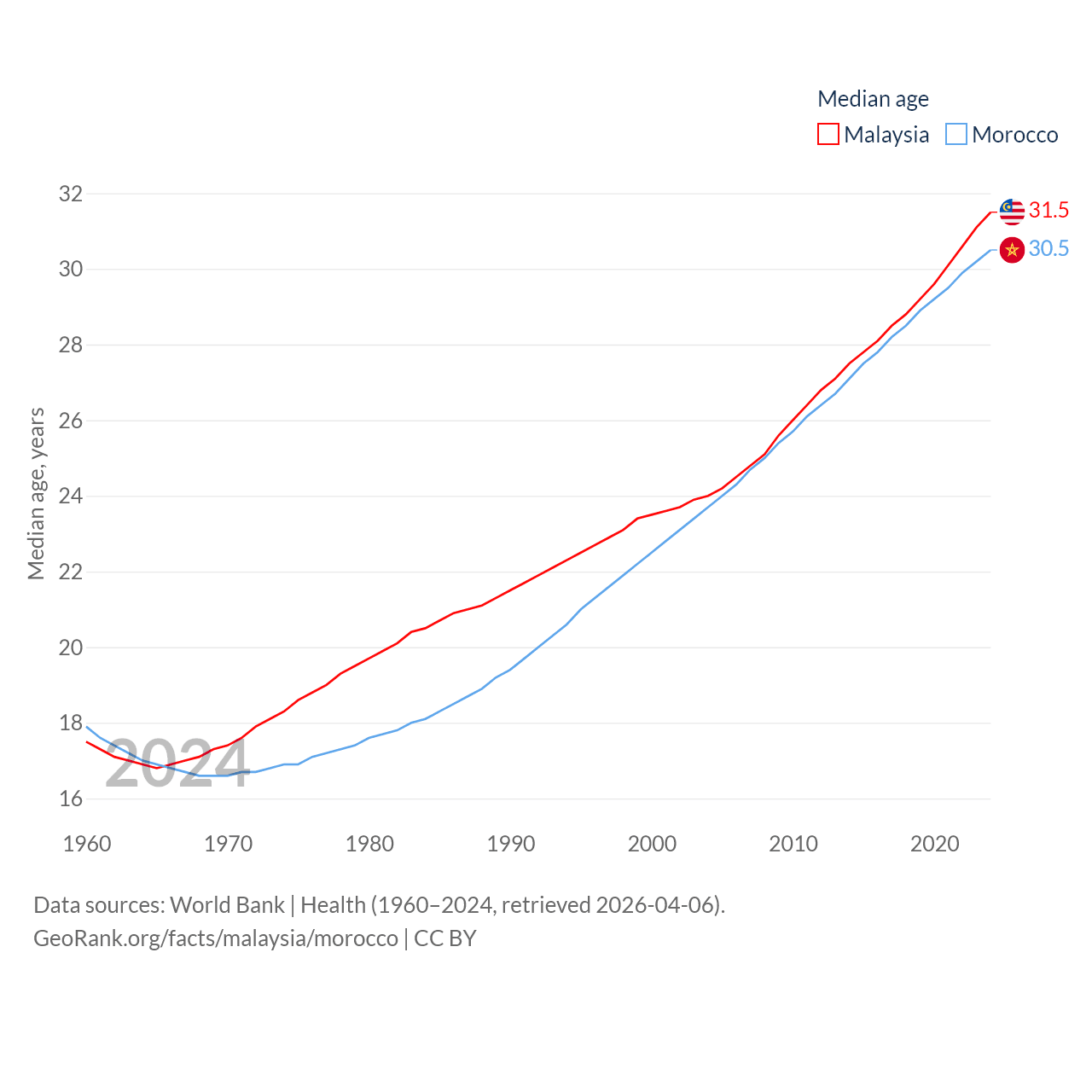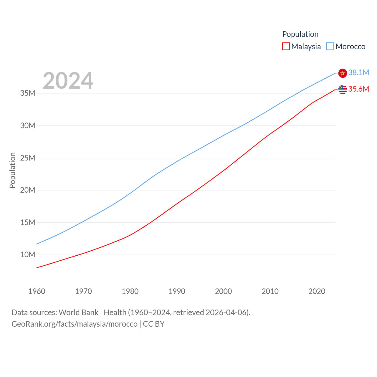 Malaysia has a population of 35.6M (ranked 44/197), compared with 38.1M in Morocco (ranked 39/197). Malaysia's land area is 126,854 sq mi versus 172,317 sq mi for Morocco (ranked 65th vs. 55th).