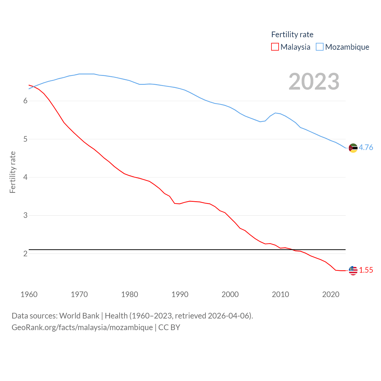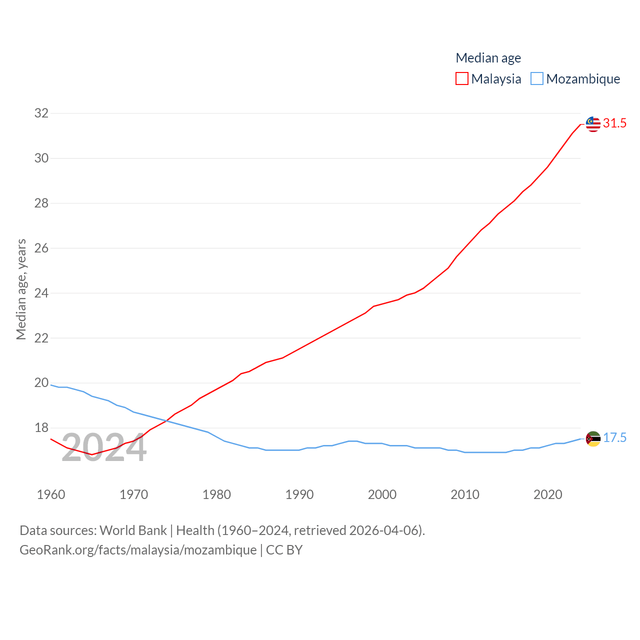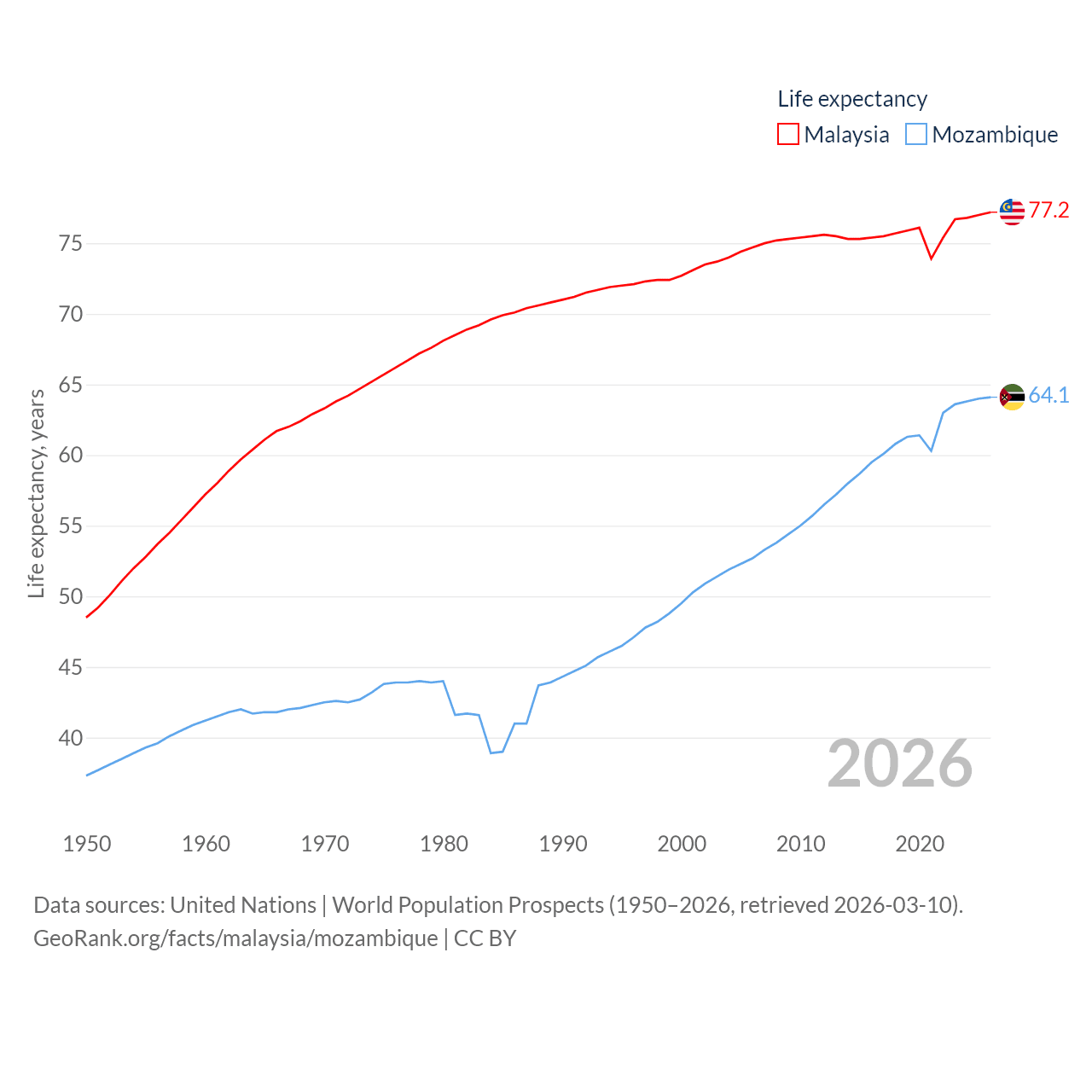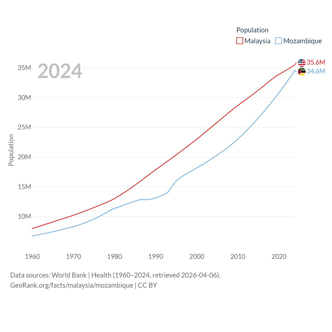 Malaysia has a population of 35.6M (ranked 44/197), compared with 34.6M in Mozambique (ranked 46/197). Malaysia's land area is 126,854 sq mi versus 303,623 sq mi for Mozambique (ranked 65th vs. 34th).