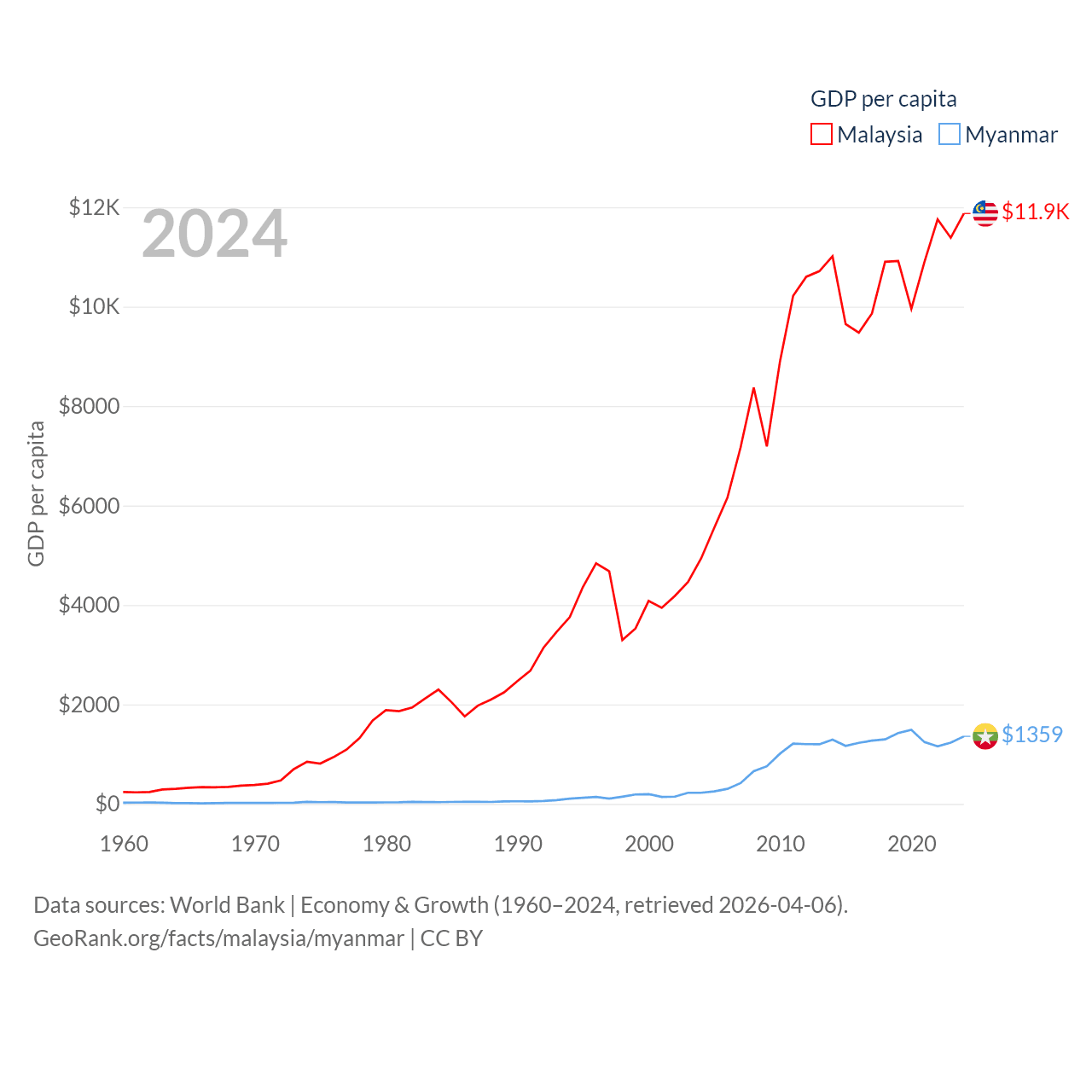 By GDP, Malaysia ranks 38/197 ($422B) and Myanmar ranks 85/197 ($74.1B). By GDP per capita, Malaysia ranks 79/197 ($11,874), while Myanmar ranks 165/197 ($1,359).