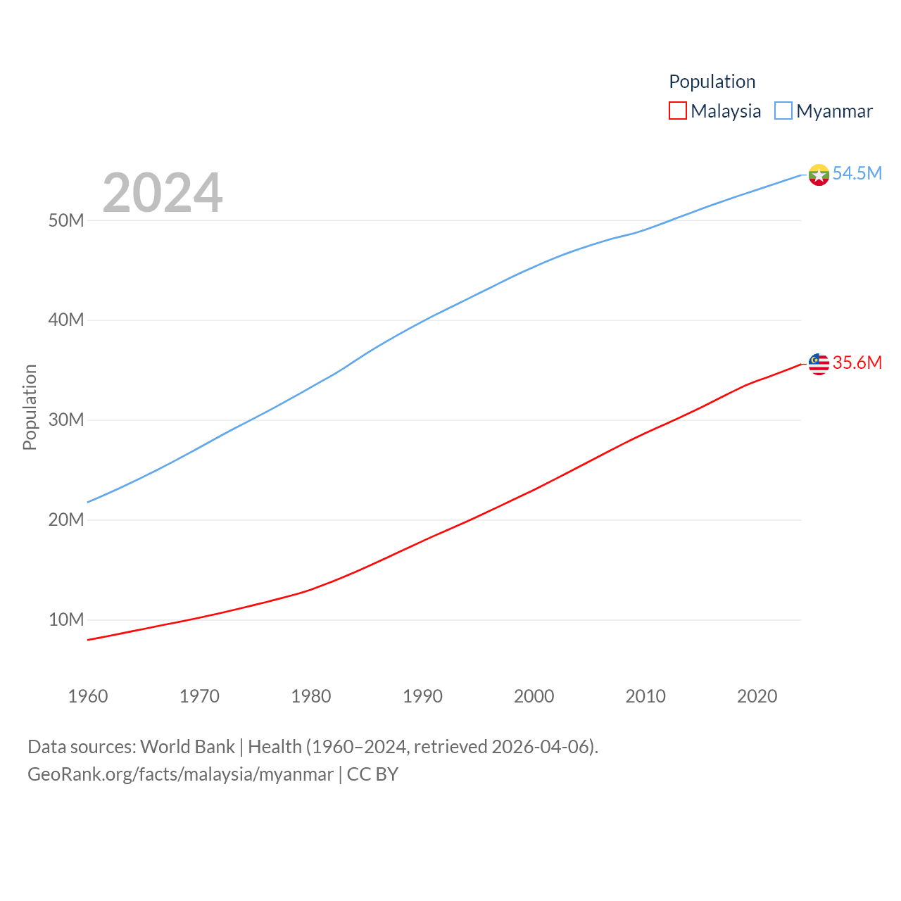 Malaysia has a population of 35.6M (ranked 44/197), compared with 54.5M in Myanmar (ranked 27/197). Malaysia's land area is 126,854 sq mi versus 251,997 sq mi for Myanmar (ranked 65th vs. 39th).