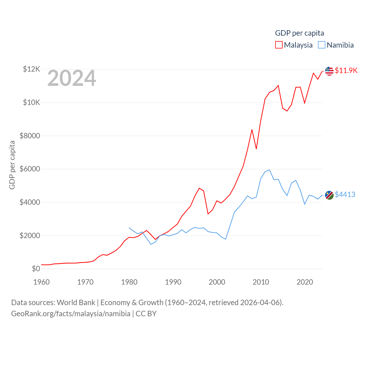 By GDP, Malaysia ranks 38/197 ($422B) and Namibia ranks 147/197 ($13.4B). By GDP per capita, Malaysia ranks 79/197 ($11,874), while Namibia ranks 126/197 ($4,413).