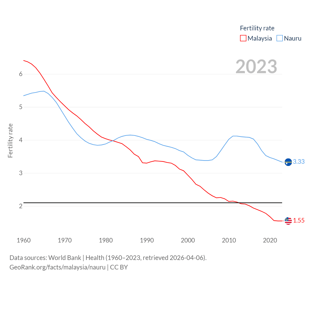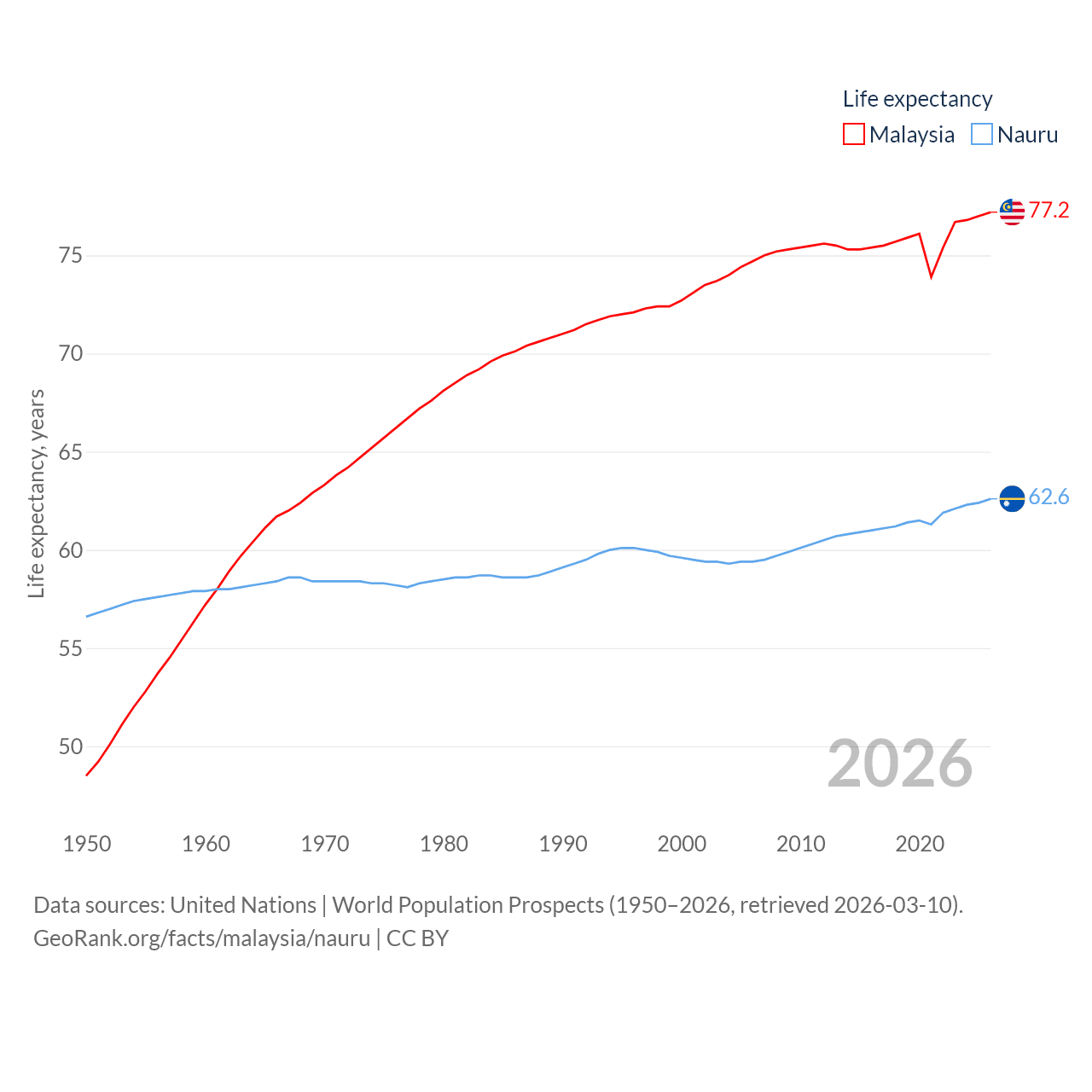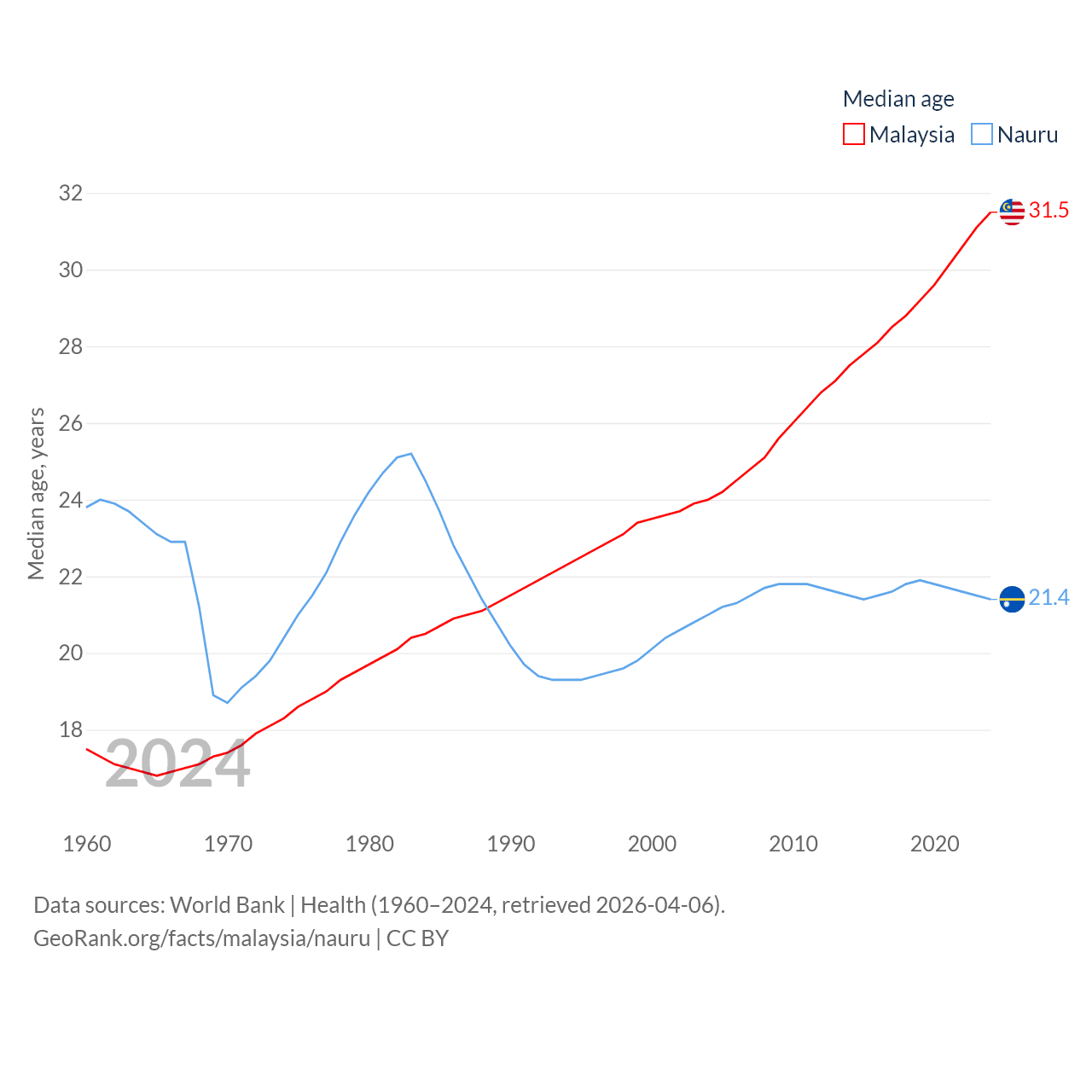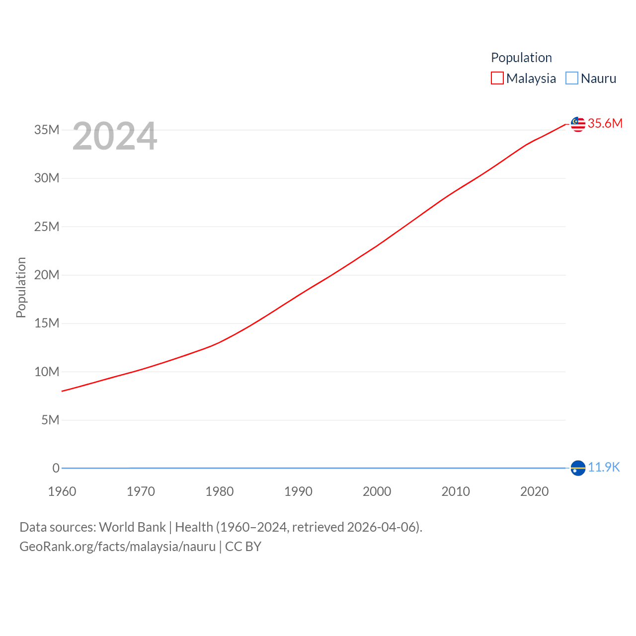Malaysia has a population of 35.6M (ranked 44/197), compared with 11.9K in Nauru (ranked 195/197). Malaysia's land area is 126,854 sq mi versus 7.72 sq mi for Nauru (ranked 65th vs. 195th).