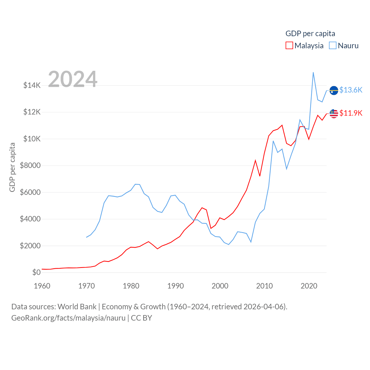 By GDP, Malaysia ranks 38/197 ($422B) and Nauru ranks 195/197 ($163M). By GDP per capita, Malaysia ranks 79/197 ($11,874), while Nauru ranks 74/197 ($13,609).