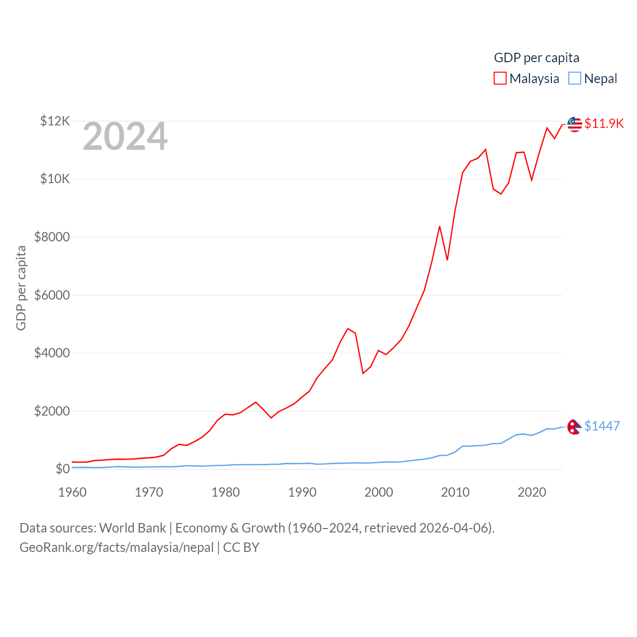 By GDP, Malaysia ranks 38/197 ($422B) and Nepal ranks 101/197 ($42.9B). By GDP per capita, Malaysia ranks 79/197 ($11,874), while Nepal ranks 164/197 ($1,447).