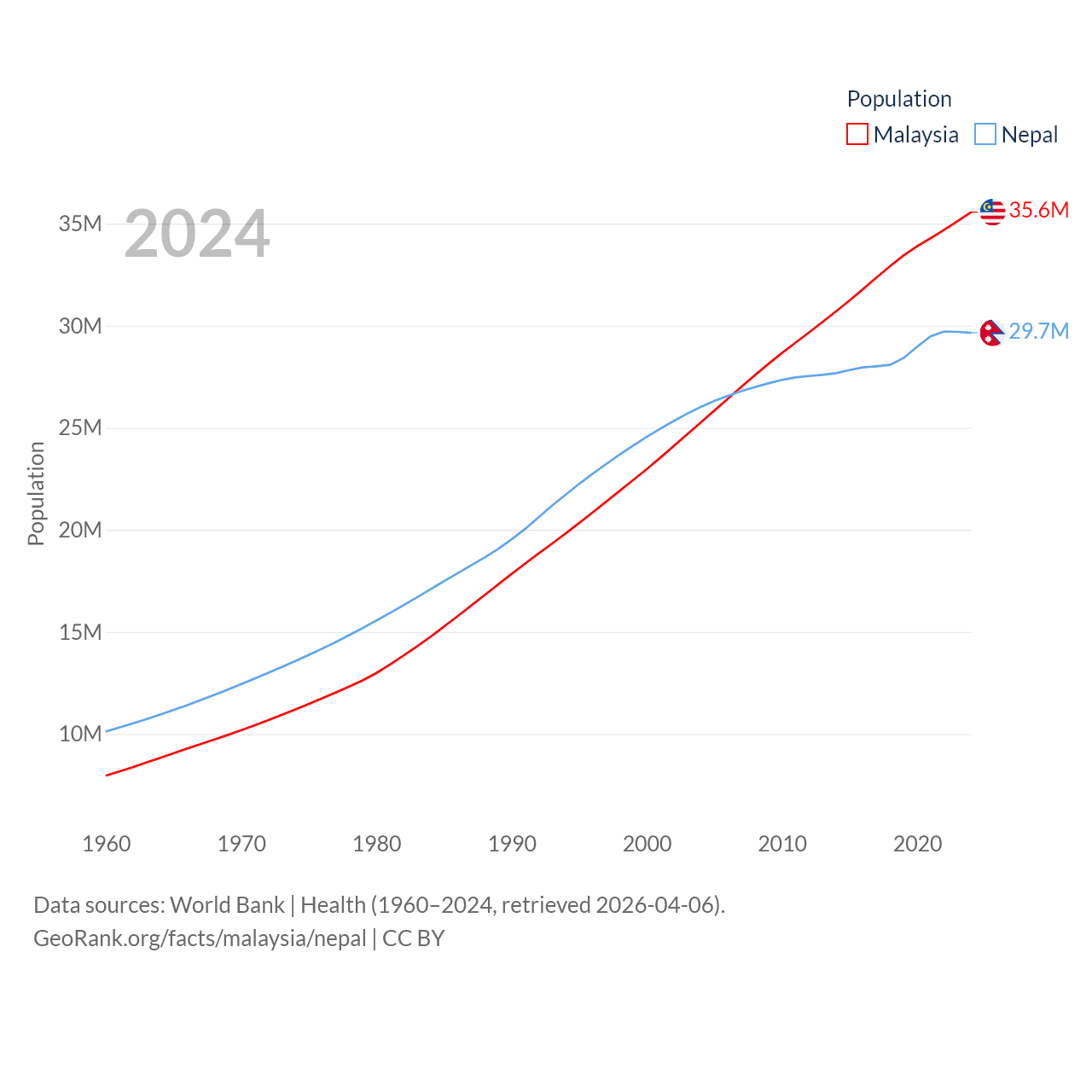 Malaysia has a population of 35.6M (ranked 44/197), compared with 29.7M in Nepal (ranked 51/197). Malaysia's land area is 126,854 sq mi versus 55,348 sq mi for Nepal (ranked 65th vs. 92nd).