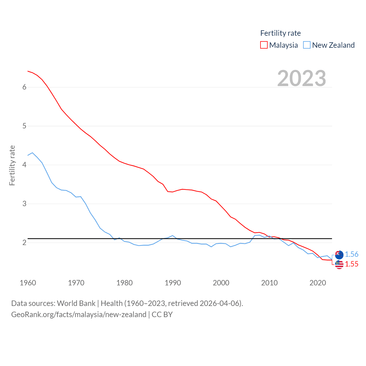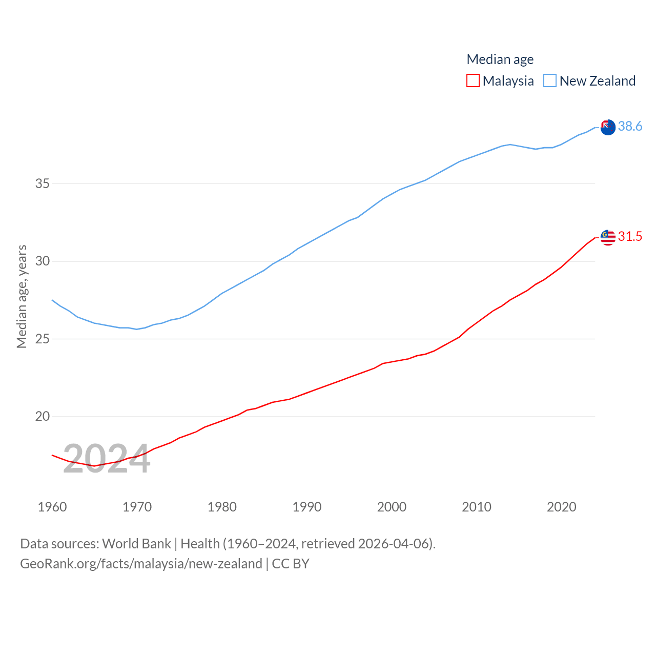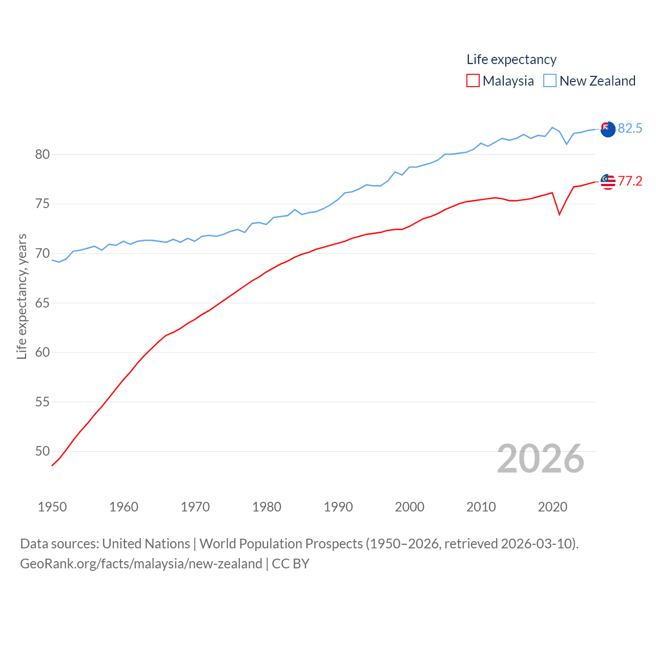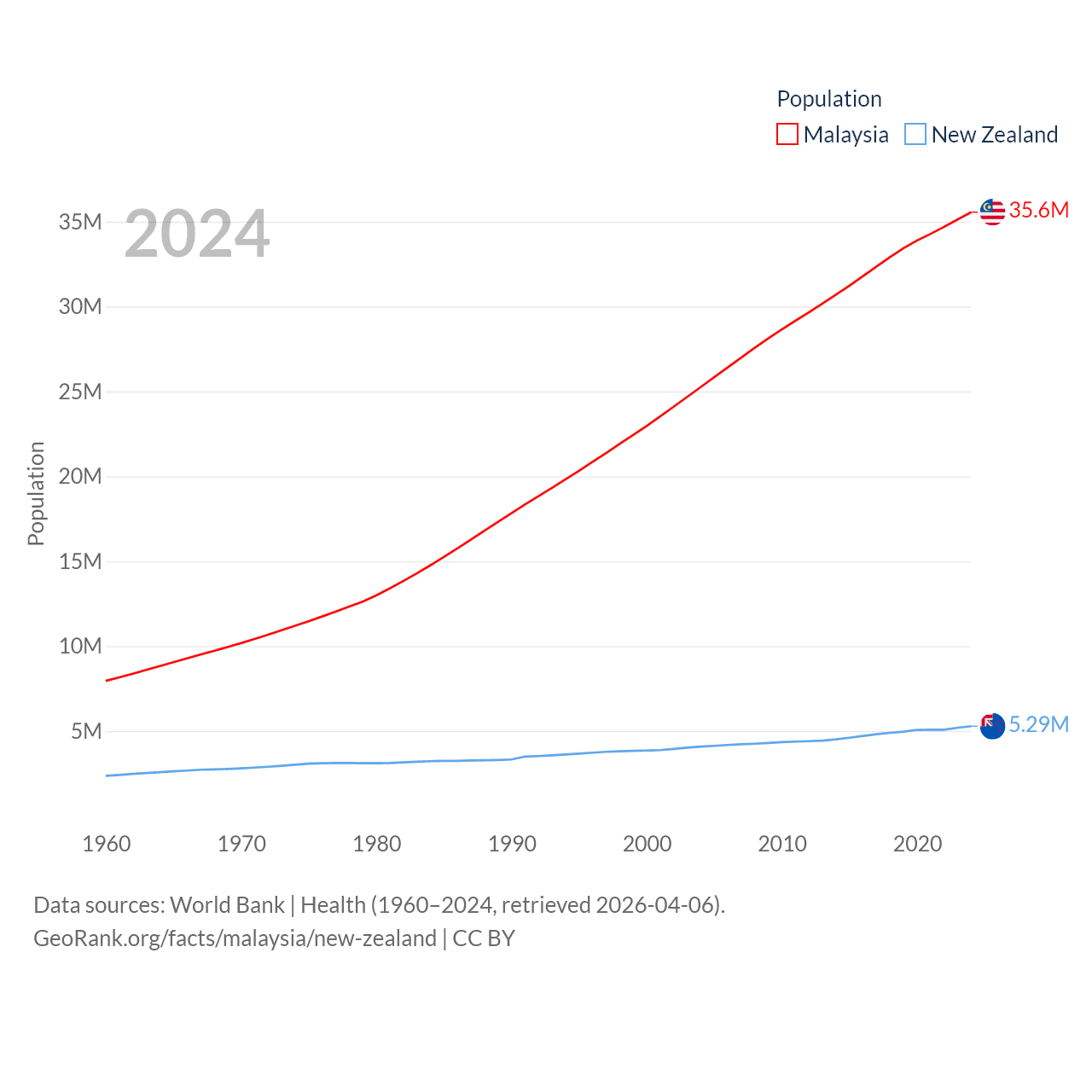 Malaysia has a population of 35.6M (ranked 44/197), compared with 5.29M in New Zealand (ranked 123/197). Malaysia's land area is 126,854 sq mi versus 101,665 sq mi for New Zealand (ranked 65th vs. 74th).