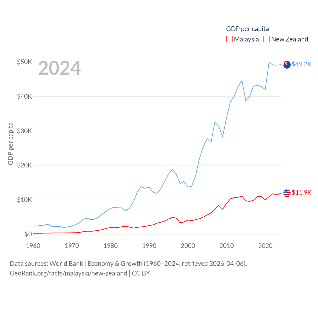 By GDP, Malaysia ranks 38/197 ($422B) and New Zealand ranks 52/197 ($260B). By GDP per capita, Malaysia ranks 79/197 ($11,874), while New Zealand ranks 26/197 ($49,205).
