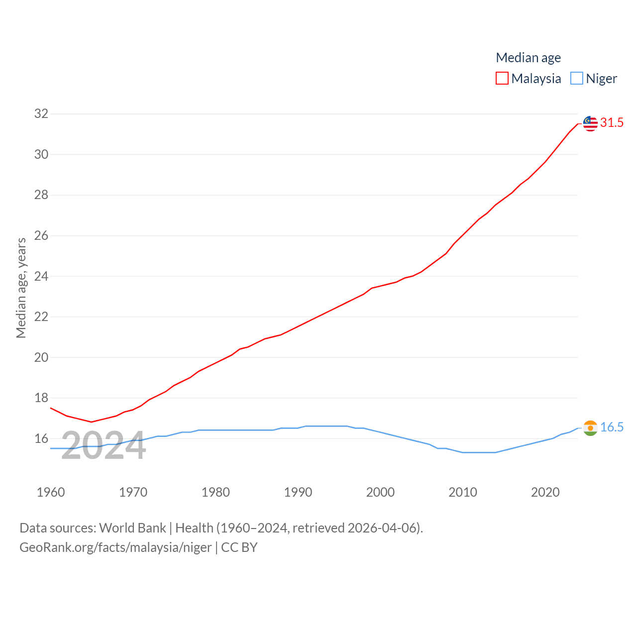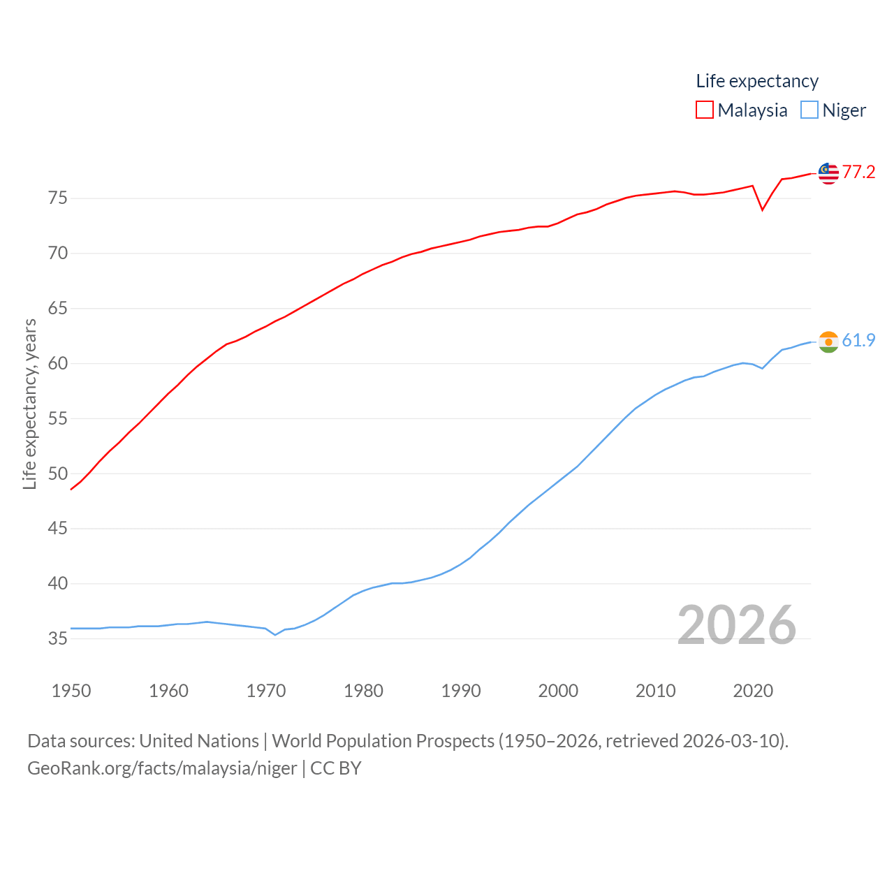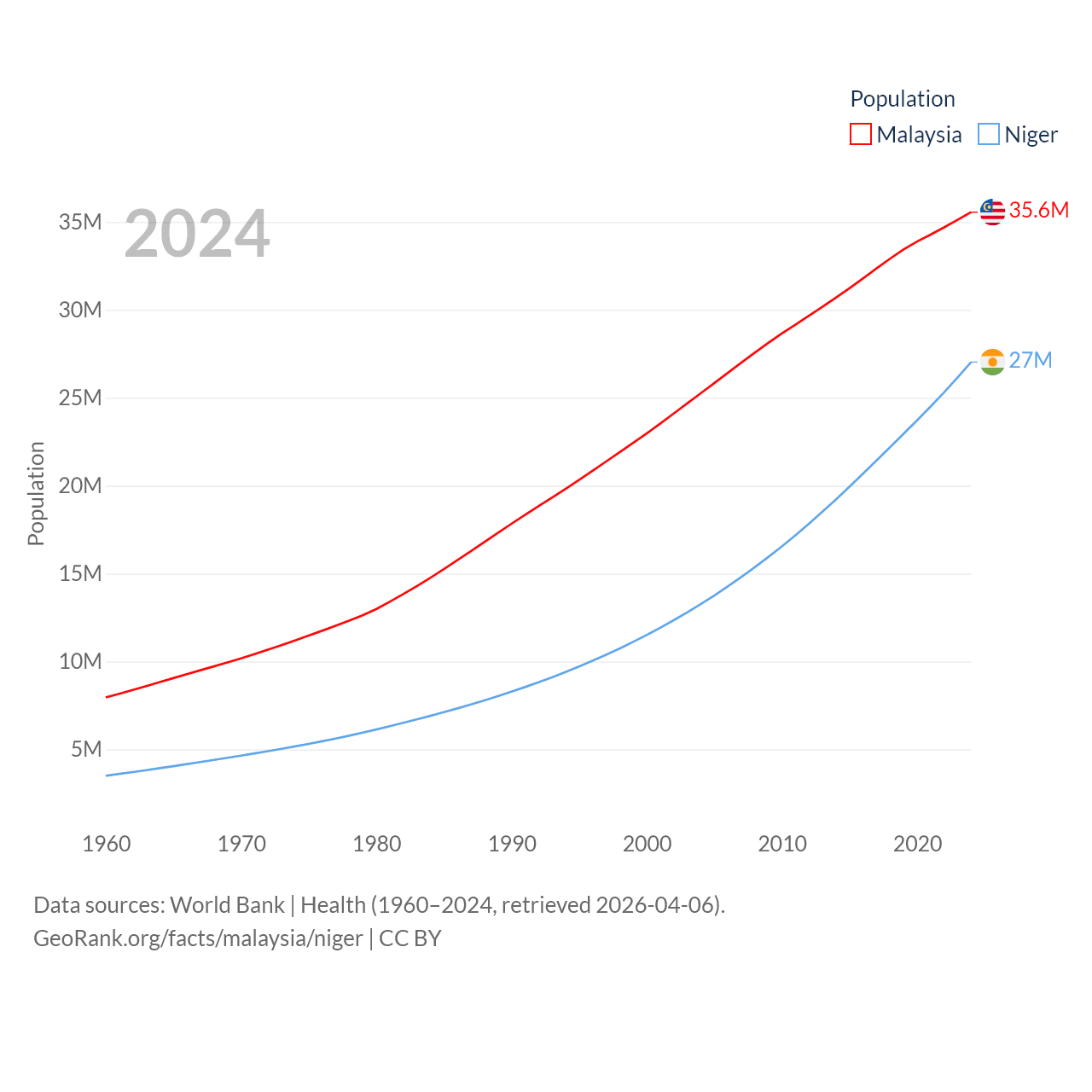 Malaysia has a population of 35.6M (ranked 44/197), compared with 27M in Niger (ranked 55/197). Malaysia's land area is 126,854 sq mi versus 489,076 sq mi for Niger (ranked 65th vs. 20th).