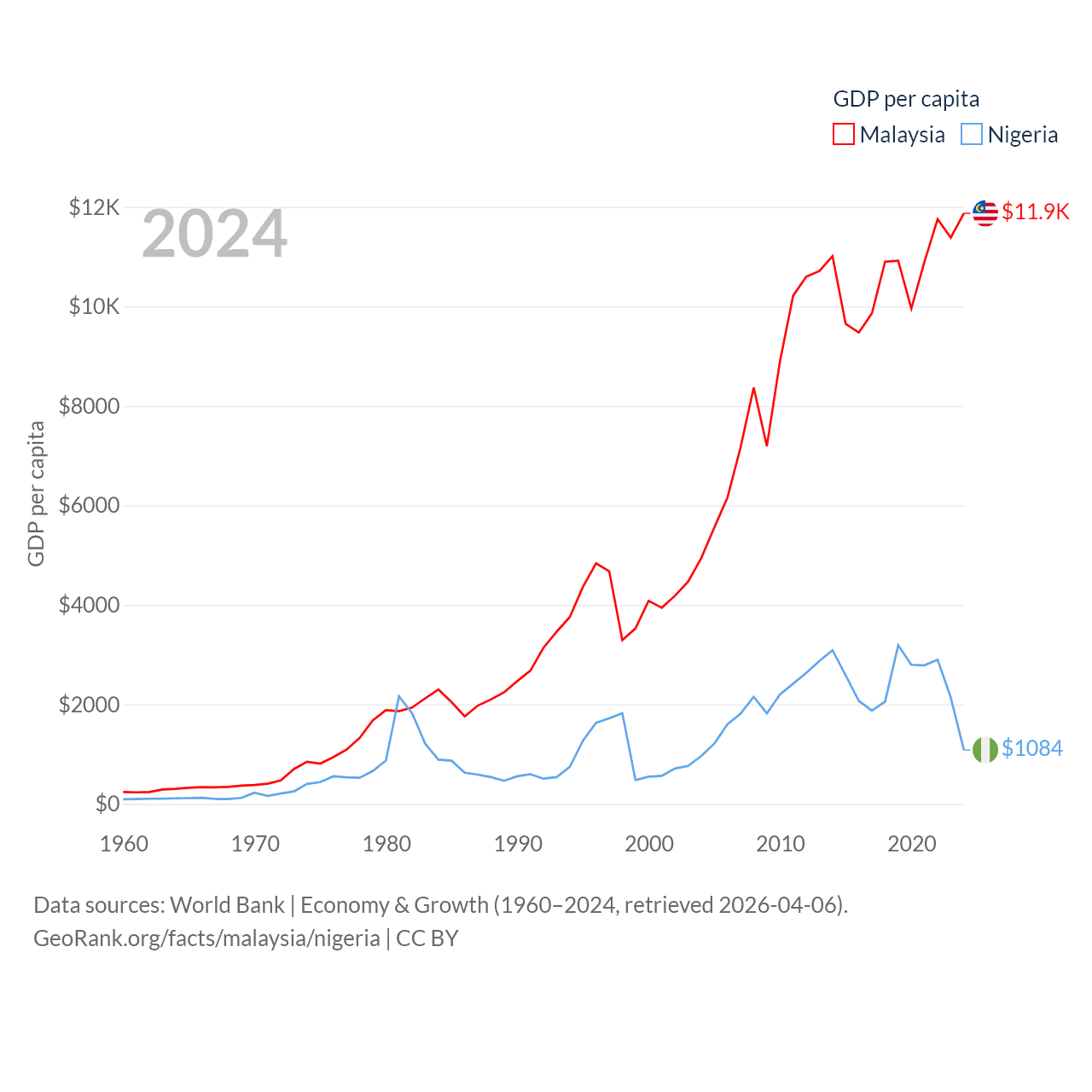 By GDP, Malaysia ranks 38/197 ($422B) and Nigeria ranks 54/197 ($252B). By GDP per capita, Malaysia ranks 79/197 ($11,874), while Nigeria ranks 174/197 ($1,084).