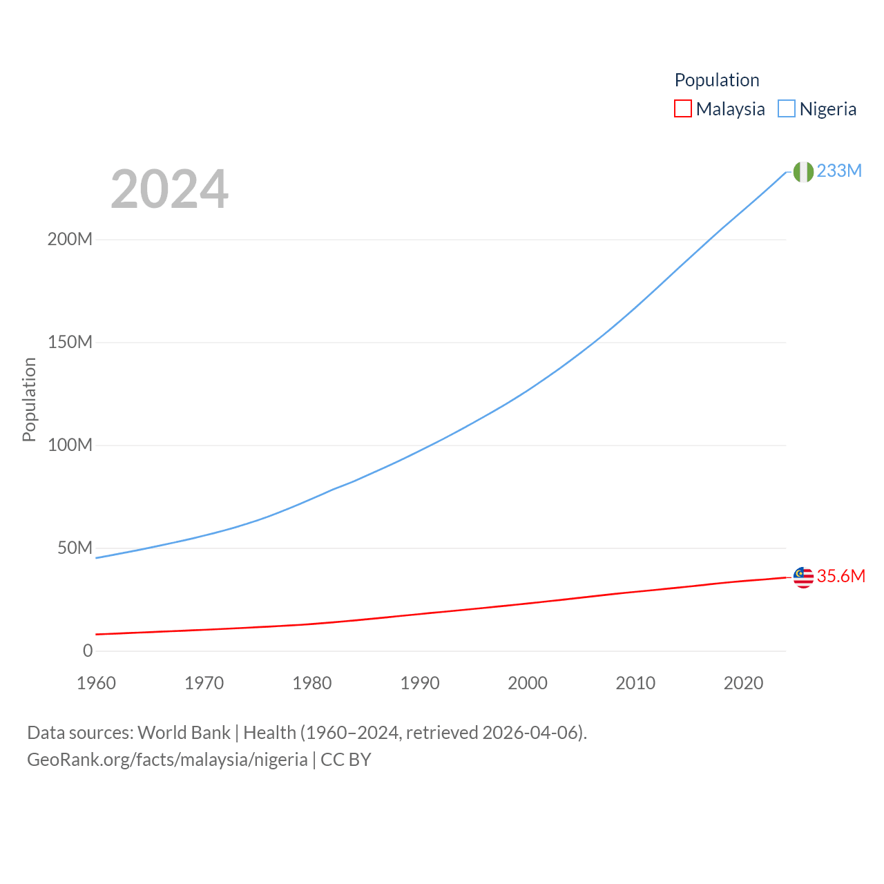 Malaysia has a population of 35.6M (ranked 44/197), compared with 233M in Nigeria (ranked 6/197). Malaysia's land area is 126,854 sq mi versus 351,650 sq mi for Nigeria (ranked 65th vs. 30th).