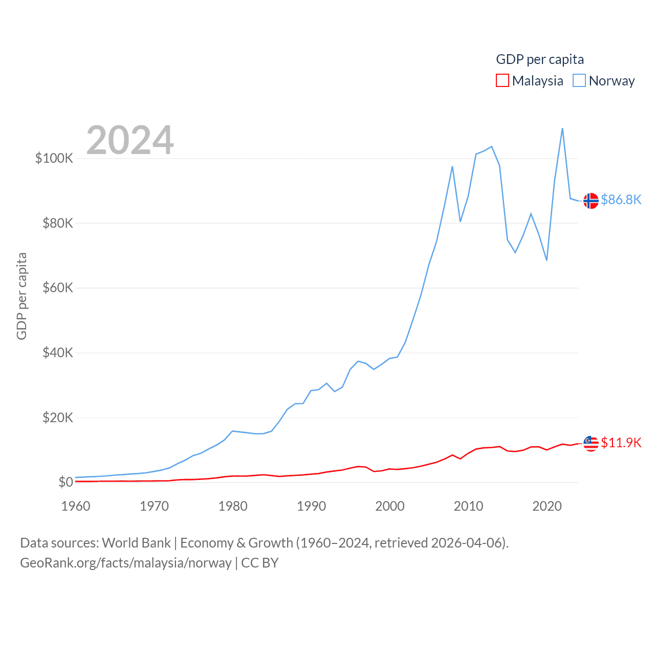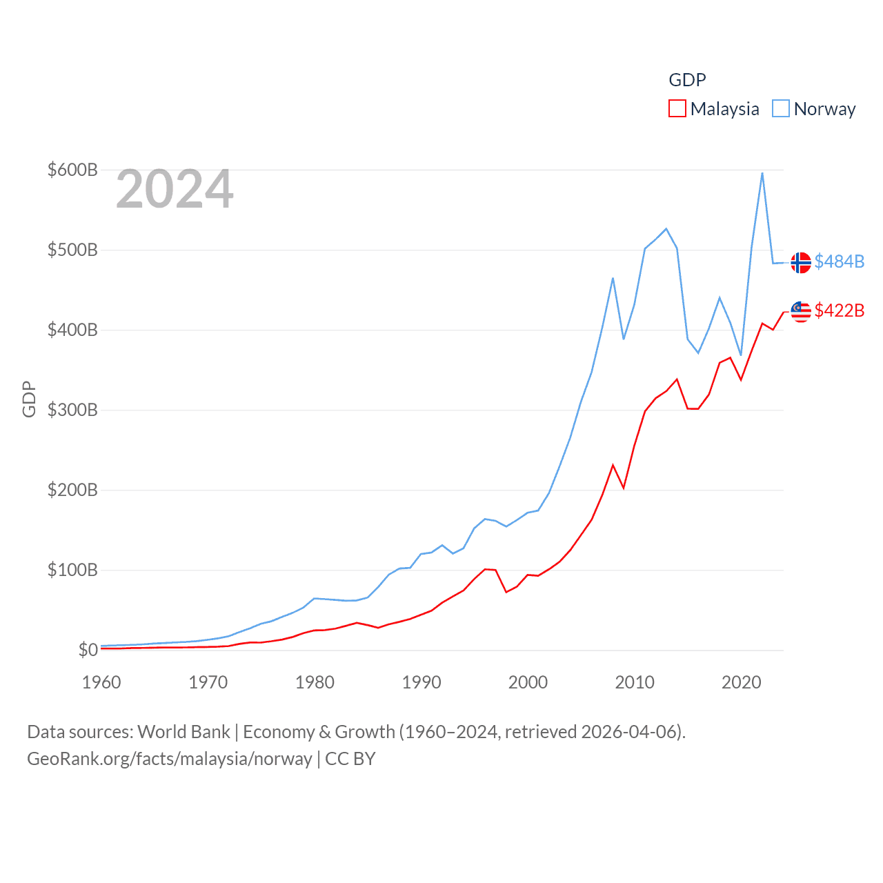 By GDP, Malaysia ranks 38/197 ($422B) and Norway ranks 32/197 ($484B). By GDP per capita, Malaysia ranks 79/197 ($11,874), while Norway ranks 8/197 ($86,785).