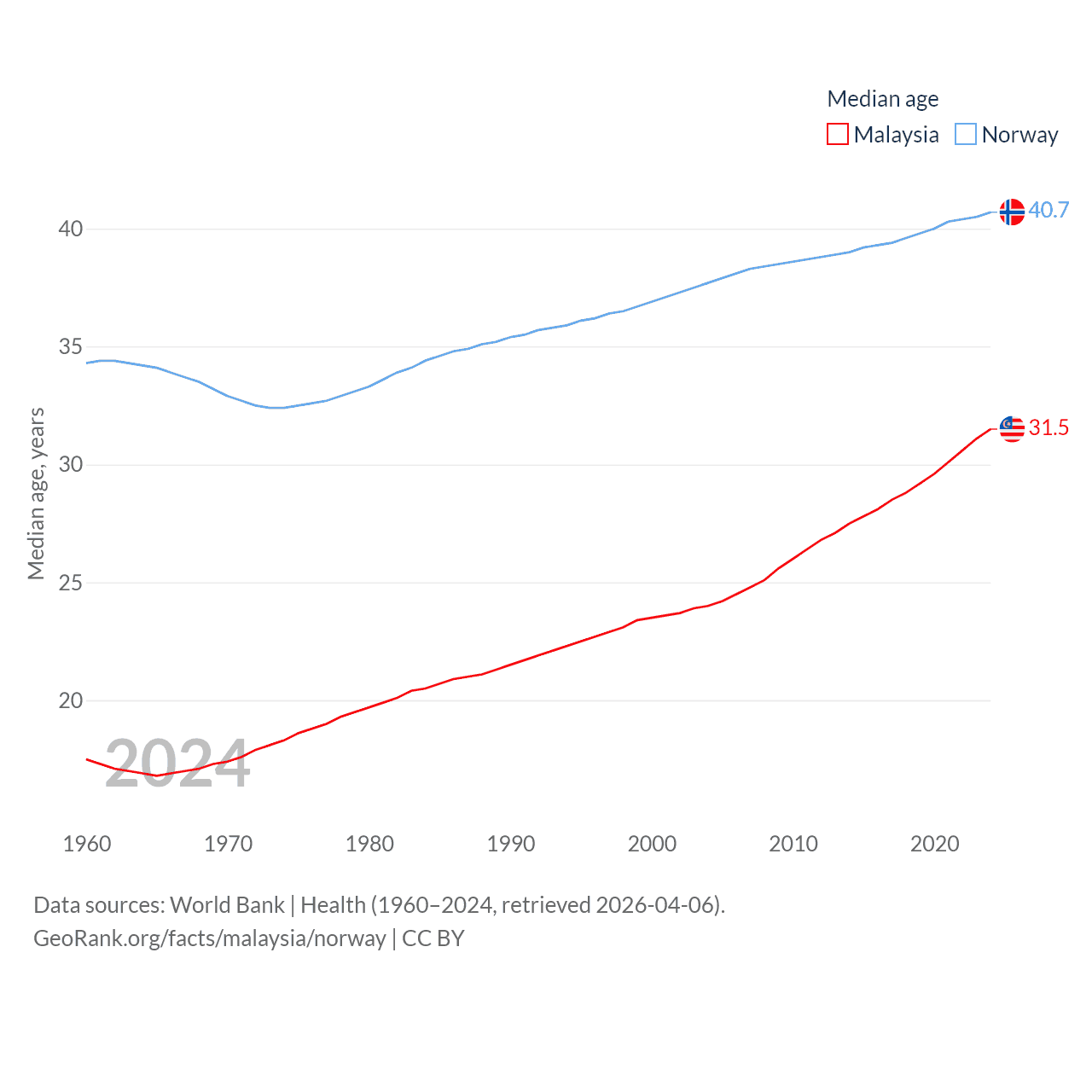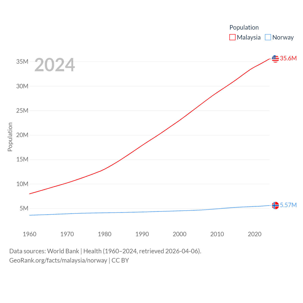 Malaysia has a population of 35.6M (ranked 44/197), compared with 5.57M in Norway (ranked 118/197). Malaysia's land area is 126,854 sq mi versus 140,645 sq mi for Norway (ranked 65th vs. 62nd).