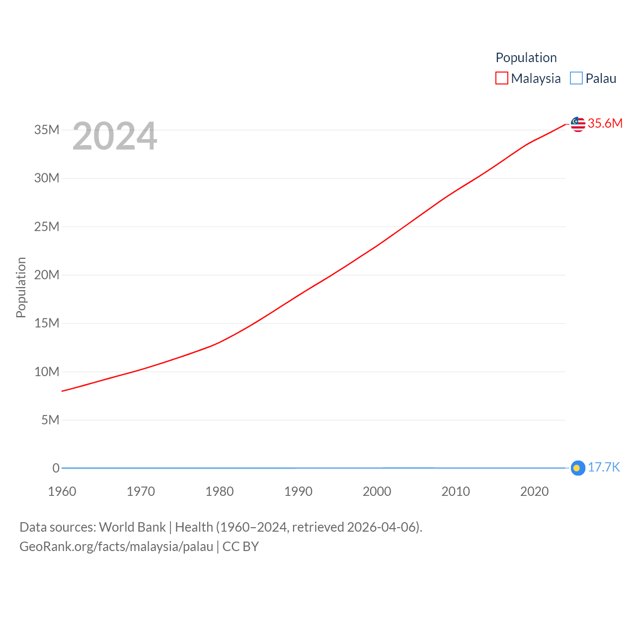 Malaysia has a population of 35.6M (ranked 44/197), compared with 17.7K in Palau (ranked 194/197). Malaysia's land area is 126,854 sq mi versus 177.6 sq mi for Palau (ranked 65th vs. 180th).