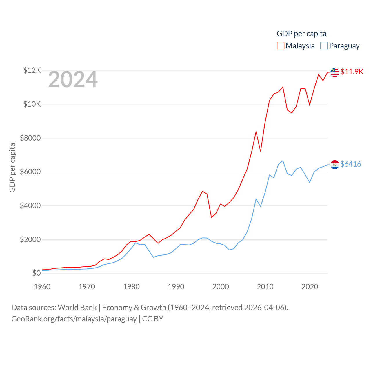 By GDP, Malaysia ranks 38/197 ($422B) and Paraguay ranks 98/197 ($44.5B). By GDP per capita, Malaysia ranks 79/197 ($11,874), while Paraguay ranks 109/197 ($6,416).