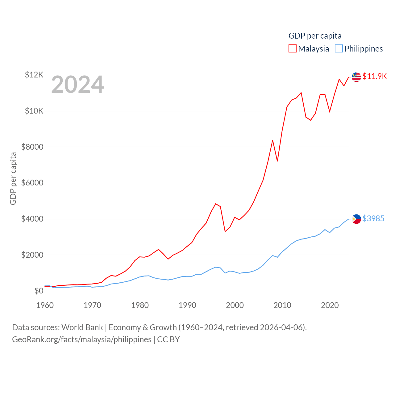 By GDP, Malaysia ranks 38/197 ($422B) and The Philippines ranks 35/197 ($462B). By GDP per capita, Malaysia ranks 79/197 ($11,874), while The Philippines ranks 130/197 ($3,985).