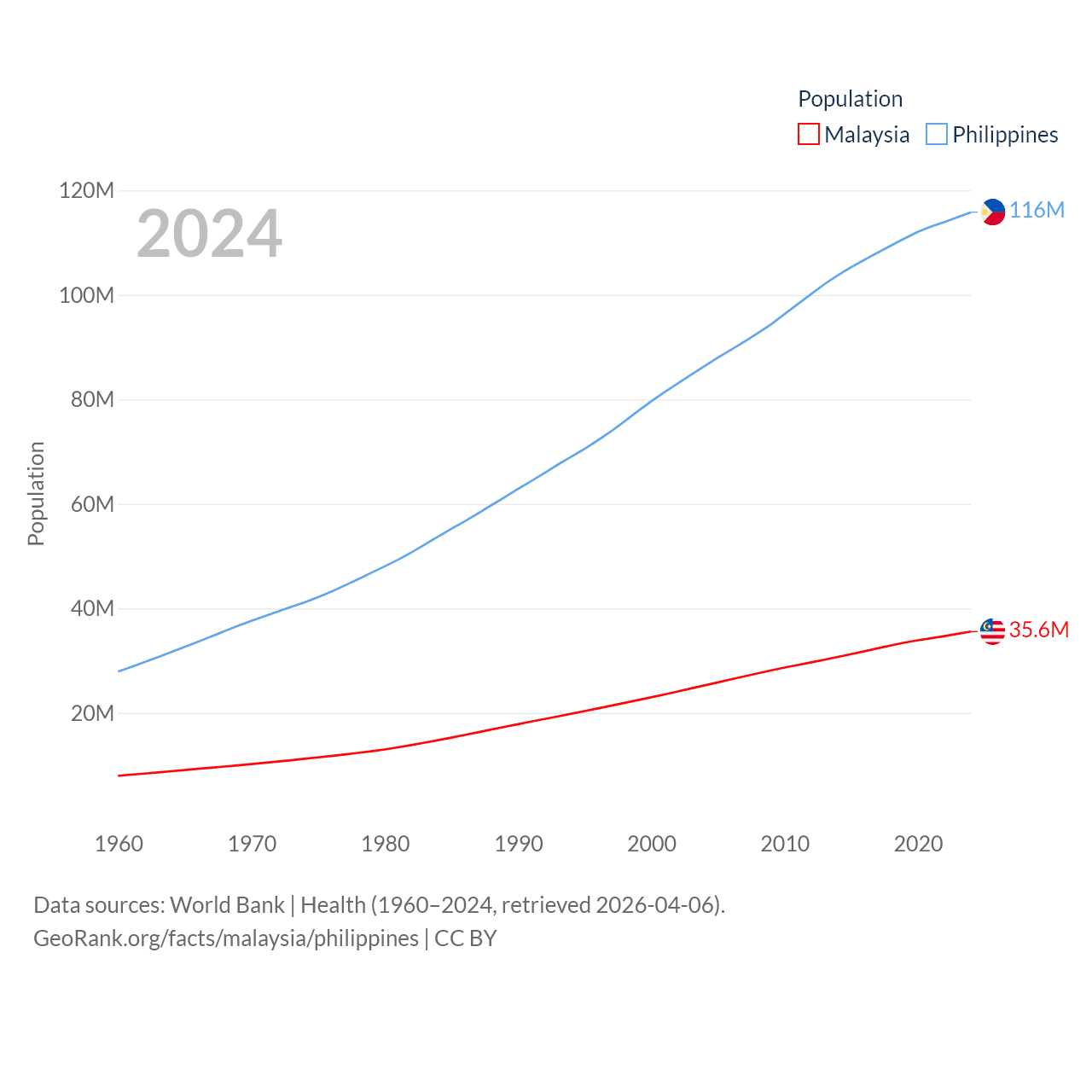 Malaysia has a population of 35.6M (ranked 44/197), compared with 116M in The Philippines (ranked 14/197). Malaysia's land area is 126,854 sq mi versus 115,124 sq mi for The Philippines (ranked 65th vs. 71st).