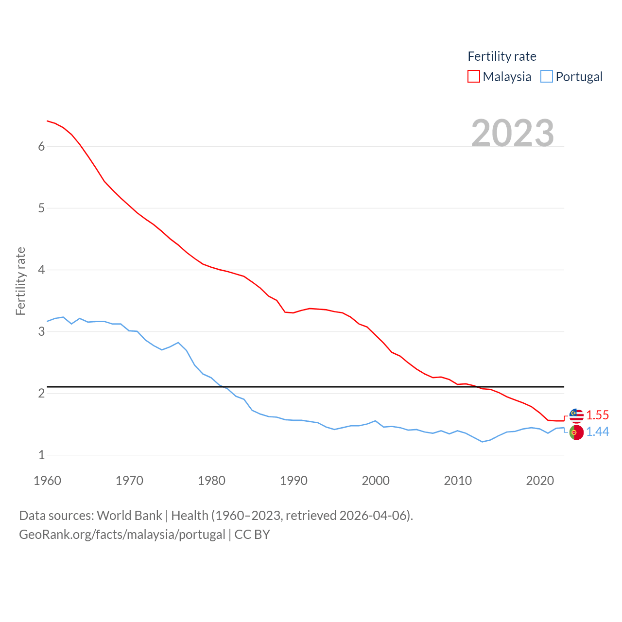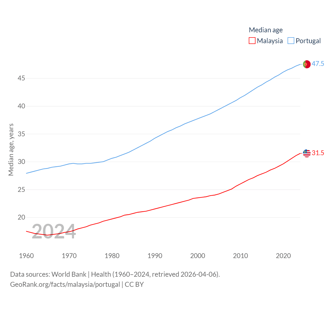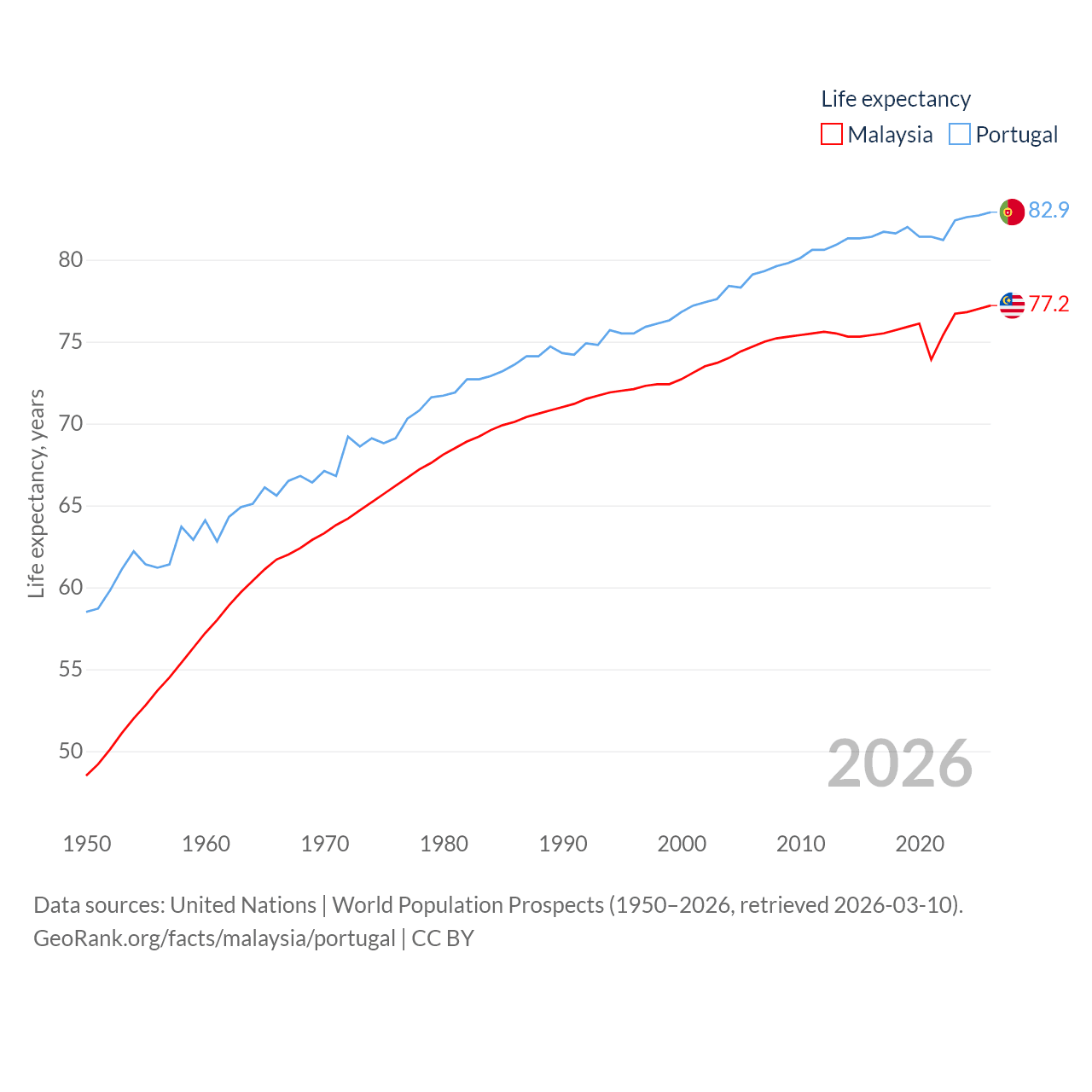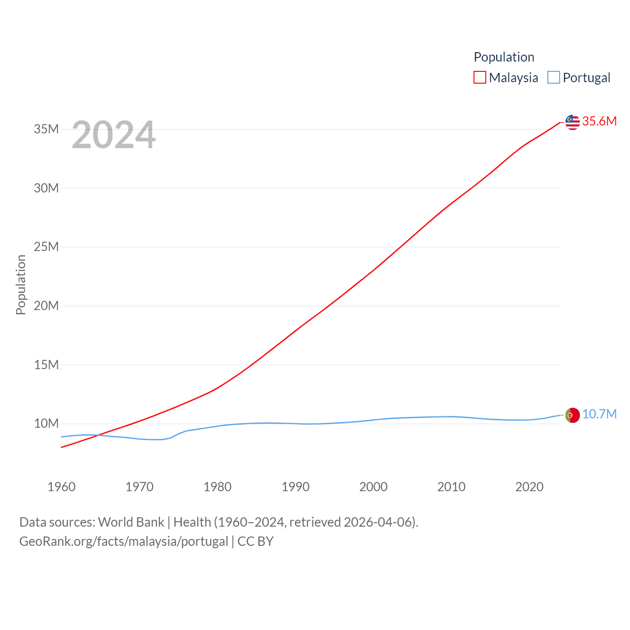 Malaysia has a population of 35.6M (ranked 44/197), compared with 10.7M in Portugal (ranked 90/197). Malaysia's land area is 126,854 sq mi versus 35,369 sq mi for Portugal (ranked 65th vs. 108th).