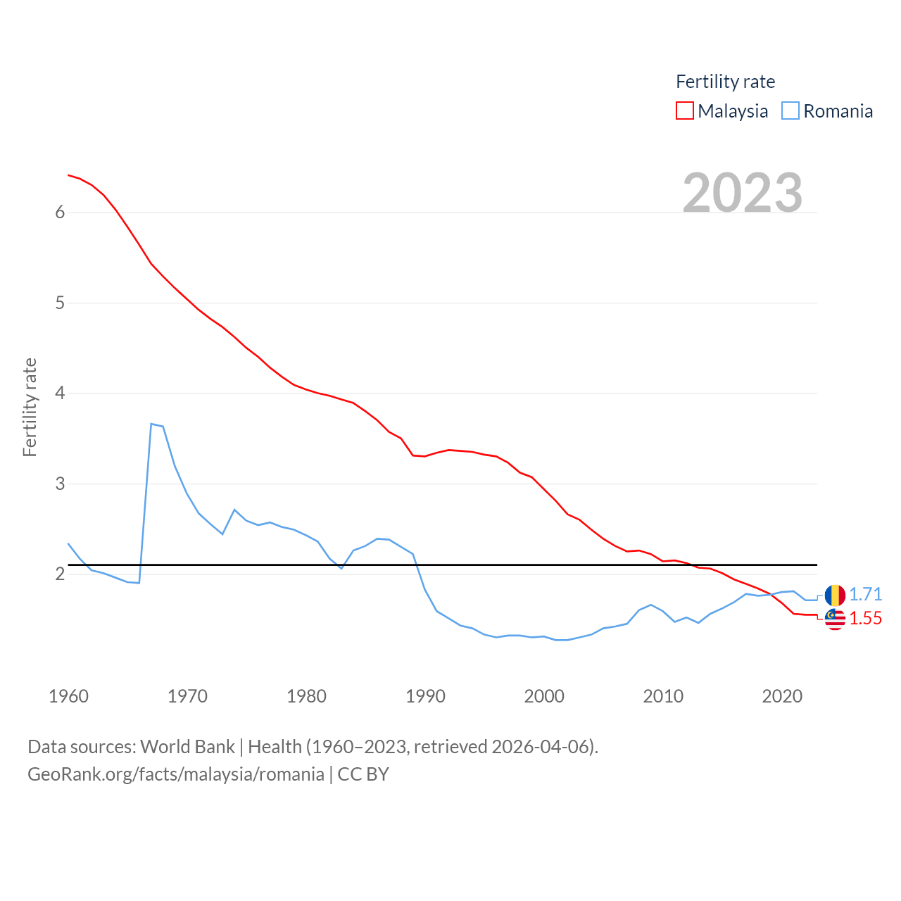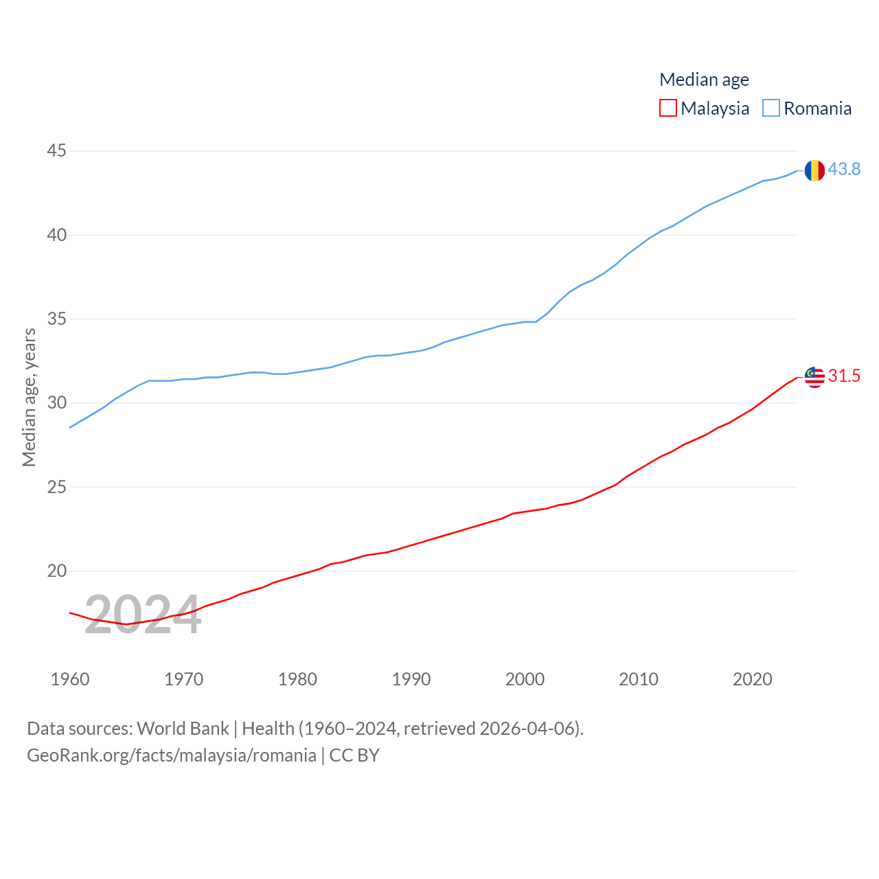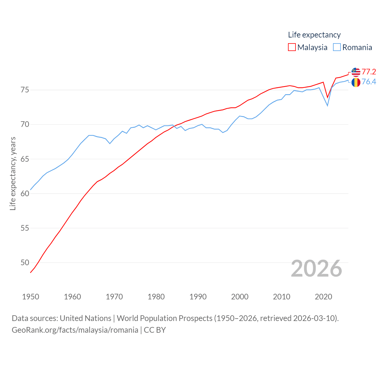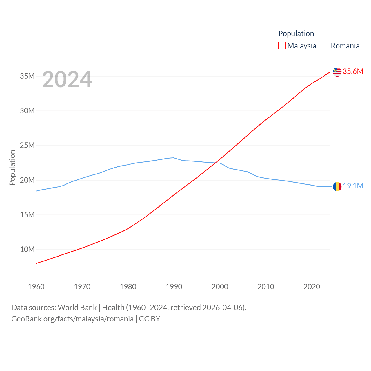 Malaysia has a population of 35.6M (ranked 44/197), compared with 19.1M in Romania (ranked 67/197). Malaysia's land area is 126,854 sq mi versus 88,834 sq mi for Romania (ranked 65th vs. 80th).