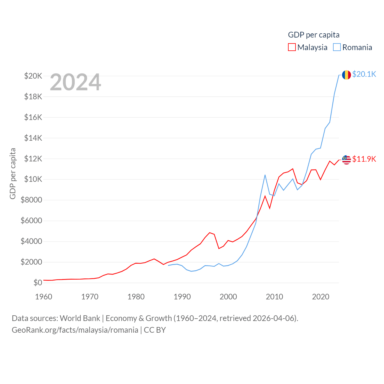 By GDP, Malaysia ranks 38/197 ($422B) and Romania ranks 42/197 ($383B). By GDP per capita, Malaysia ranks 79/197 ($11,874), while Romania ranks 58/197 ($20,080).